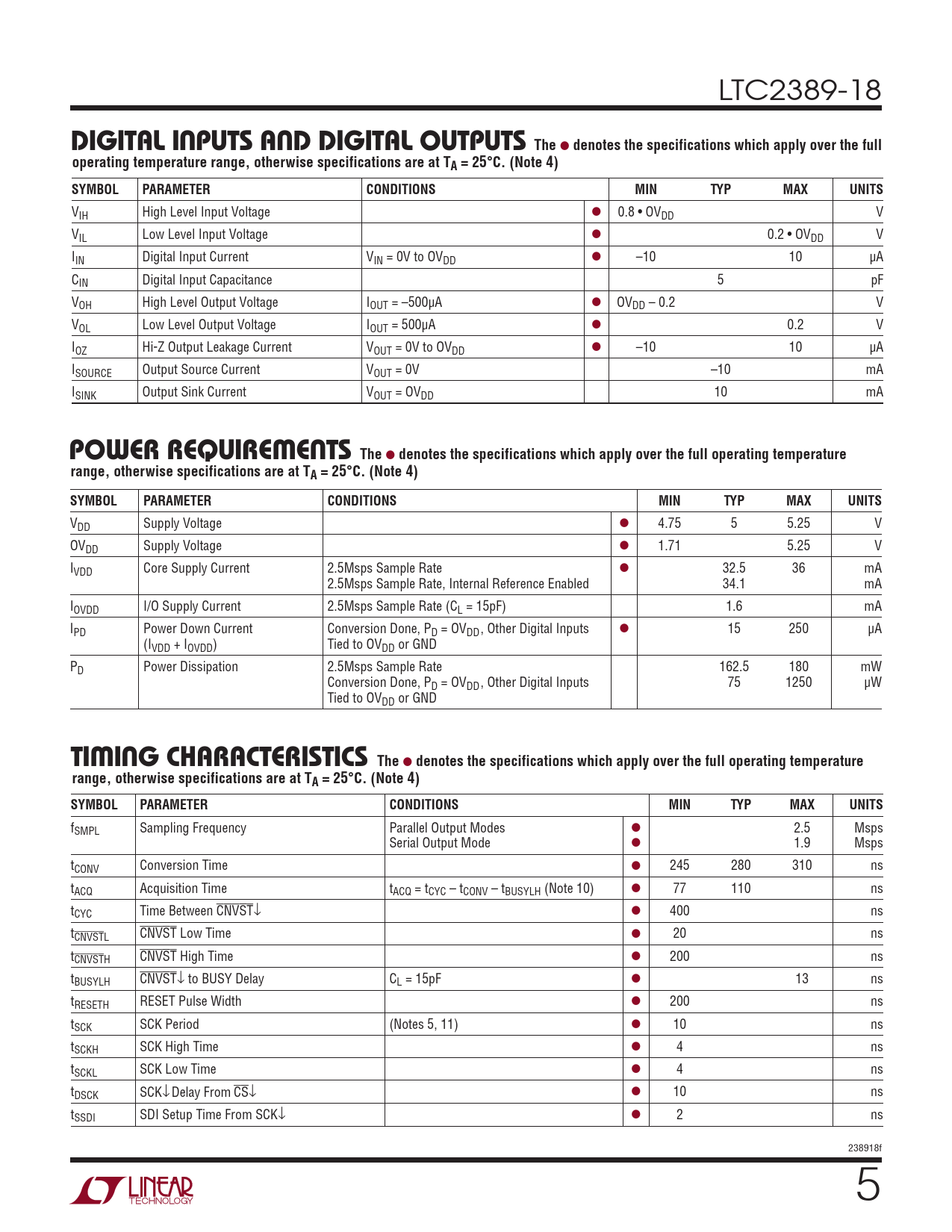 LTC2389-18 DigiTal inpuTs anD DigiTal ouTpuTs The l denotes the specifications which apply over the fulloperating temperature range, otherwise specifications are at TA = 25°C. (Note 4)SYMBOLPARAMETERCONDITIONSMINTYPMAXUNITS VIH High Level Input Voltage l 0.8 • OVDD V VIL Low Level Input Voltage l 0.2 • OVDD V IIN Digital Input Current VIN = 0V to OVDD l –10 10 µA CIN Digital Input Capacitance 5 pF VOH High Level Output Voltage IOUT = –500µA l OVDD – 0.2 V VOL Low Level Output Voltage IOUT = 500µA l 0.2 V IOZ Hi-Z Output Leakage Current VOUT = 0V to OVDD l –10 10 µA ISOURCE Output Source Current VOUT = 0V –10 mA ISINK Output Sink Current VOUT = OVDD 10 mA p ower requiremenTs The l denotes the specifications which apply over the full operating temperaturerange, otherwise specifications are at TA = 25°C. (Note 4)SYMBOLPARAMETERCONDITIONSMINTYPMAXUNITS VDD Supply Voltage l 4.75 5 5.25 V OVDD Supply Voltage l 1.71 5.25 V IVDD Core Supply Current 2.5Msps Sample Rate l 32.5 36 mA 2.5Msps Sample Rate, Internal Reference Enabled 34.1 mA IOVDD I/O Supply Current 2.5Msps Sample Rate (CL = 15pF) 1.6 mA IPD Power Down Current Conversion Done, PD = OVDD, Other Digital Inputs l 15 250 µA (IVDD + IOVDD) Tied to OVDD or GND PD Power Dissipation 2.5Msps Sample Rate 162.5 180 mW Conversion Done, PD = OVDD, Other Digital Inputs 75 1250 µW Tied to OVDD or GND TimingcharacTerisTics The l denotes the specifications which apply over the full operating temperaturerange, otherwise specifications are at TA = 25°C. (Note 4)SYMBOLPARAMETERCONDITIONSMINTYPMAXUNITS fSMPL Sampling Frequency Parallel Output Modes l 2.5 Msps Serial Output Mode l 1.9 Msps tCONV Conversion Time l 245 280 310 ns tACQ Acquisition Time tACQ = tCYC – tCONV – tBUSYLH (Note 10) l 77 110 ns tCYC Time Between CNVST↓ l 400 ns tCNVSTL CNVST Low Time l 20 ns tCNVSTH CNVST High Time l 200 ns tBUSYLH CNVST↓ to BUSY Delay CL = 15pF l 13 ns tRESETH RESET Pulse Width l 200 ns tSCK SCK Period (Notes 5, 11) l 10 ns tSCKH SCK High Time l 4 ns tSCKL SCK Low Time l 4 ns tDSCK SCK↓ Delay From CS↓ l 10 ns tSSDI SDI Setup Time From SCK↓ l 2 ns 238918f 5 Document Outline Features Applications Description Typical Application Absolute Maximum Ratings Pin Configuration Order Information Analog Input Converter Characteristics Dynamic Accuracy Reference Characteristics Digital Inputs And Digital Outputs Power Requirements Timing Characteristics Typical Performance Characteristics Pin Functions Functional Block Diagram Timing Diagrams Applications Information Package Description Typical Application Related Parts