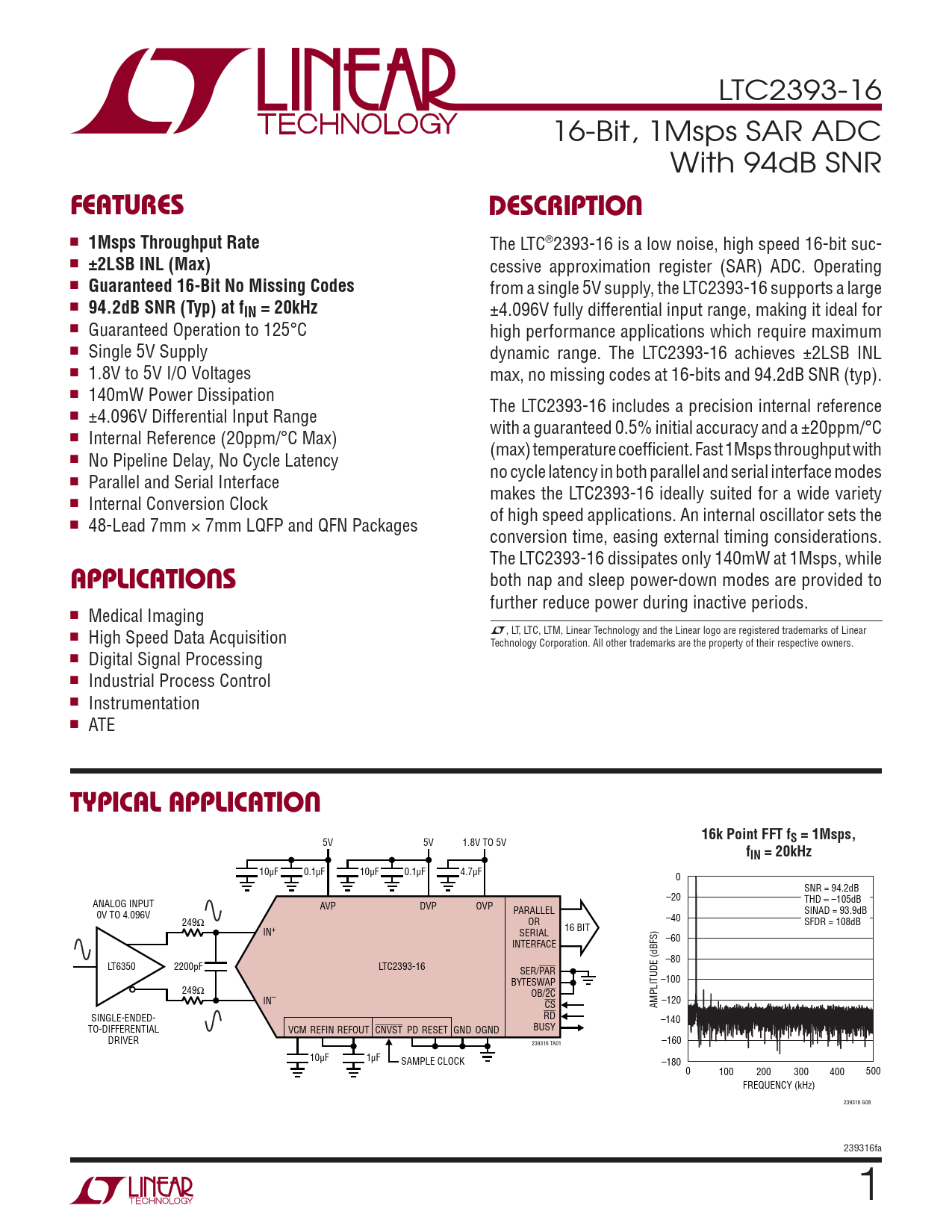 LTC2393-16 16-Bit, 1Msps SAR ADC With 94dB SNR