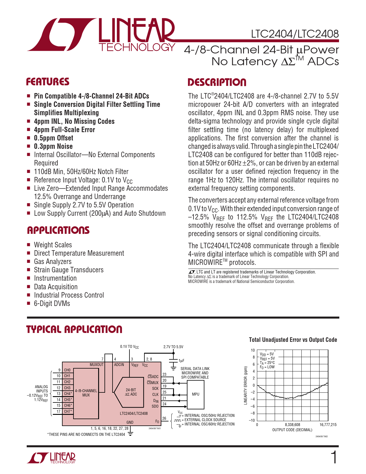 LTC2404/LTC2408 4-/8-Channel 24-Bit µPower No Latency ∆ΣTM ADCs UFEATURESDESCRIPTIO ■ Pin Compatible 4-/8-Channel 24-Bit ADCs The LTC®2404/LTC2408 are 4-/8-channel 2.7V to 5.5V ■ Single Conversion Digital Filter Settling Time micropower 24-bit A/D converters with an integrated Simplifies Multiplexing oscillator, 4ppm INL and 0.3ppm RMS noise. They use ■ 4ppm INL, No Missing Codes delta-sigma technology and provide single cycle digital ■ 4ppm Full-Scale Error filter settling time (no latency delay) for multiplexed ■ 0.5ppm Offset applications. The first conversion after the channel is ■ 0.3ppm Noise changed is always valid. Through a single pin the LTC2404/ ■ Internal Oscillator—No External Components LTC2408 can be configured for better than 110dB rejec- Required tion at 50Hz or 60Hz ±2%, or can be driven by an external ■ 110dB Min, 50Hz/60Hz Notch Filter oscillator for a user defined rejection frequency in the ■ Reference Input Voltage: 0.1V to V range 1Hz to 120Hz. The internal oscillator requires no CC ■ Live Zero—Extended Input Range Accommodates external frequency setting components. 12.5% Overrange and Underrange The converters accept any external reference voltage from ■ Single Supply 2.7V to 5.5V Operation 0.1V to VCC. With their extended input conversion range of ■ Low Supply Current (200µA) and Auto Shutdown –12.5% VREF to 112.5% VREF the LTC2404/LTC2408 U smoothly resolve the offset and overrange problems of APPLICATIO S preceding sensors or signal conditioning circuits. ■ Weight Scales The LTC2404/LTC2408 communicate through a flexible ■ Direct Temperature Measurement 4-wire digital interface which is compatible with SPI and ■ Gas Analyzers MICROWIRETM protocols. ■ Strain Gauge Transducers , LTC and LT are registered trademarks of Linear Technology Corporation. No Latency ■ ∆Σ is a trademark of Linear Technology Corporation. Instrumentation MICROWIRE is a trademark of National Semiconductor Corporation. ■ Data Acquisition ■ Industrial Process Control ■ 6-Digit DVMs UTYPICAL APPLICATIOTotal Unadjusted Error vs Output Code 0.1V TO VCC 2.7V TO 5.5V 10 VDD = 5V 8 7 4 3 2, 8 V 1µF REF = 5V T MUXOUT ADCIN V A = 25°C REF VCC 6 FO = LOW 9 CH0 SERIAL DATA LINK MICROWIRE AND 4 10 CH1 23 CSADC SPI COMPATABLE 2 11 CH2 20 CSMUX ANALOG 0 12 CH3 19 SCK INPUTS 4-/8-CHANNEL 24-BIT 13 CH4* 25 –2 –0.12V ∆Σ ADC CLK MPU REF TO MUX 1.12V 21 –4 REF 14 CH5* DIN LINEARITY ERROR (ppm) 15 CH6* 24 SDO –6 17 CH7* LTC2404/LTC2408 VCC –8 = INTERNAL OSC/50Hz REJECTION 26 = EXTERNAL CLOCK SOURCE –10 GND FO = INTERNAL OSC/60Hz REJECTION 0 8,338,608 16,777,215 2404/08 TA01 1, 5, 6, 16, 18, 22, 27, 28 OUTPUT CODE (DECIMAL) *THESE PINS ARE NO CONNECTS ON THE LTC2404 2404/08 TA02 1