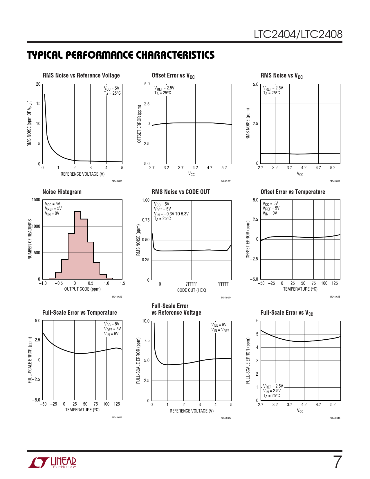 1500 1.00 5.0 VCC = 5V V V CC = 5V CC = 5V VREF = 5V V V REF = 5V REF = 5V VIN = 0V V V IN = – 0.3V TO 5.3V IN = 0V 0.75 TA = 25°C 2.5 1000 0.50 0 500 RMS NOISE (ppm) NUMBER OF READINGS OFFSET ERROR (ppm) 0.25 – 2.5 0 0 – 5.0 –1.0 – 0.5 0 0.5 1.0 1.5 0 7FFFFF FFFFFF – 50 –25 0 25 50 75 100 125 OUTPUT CODE (ppm) CODE OUT (HEX) TEMPERATURE (°C) 24048 G13 24048 G14 24048 G15