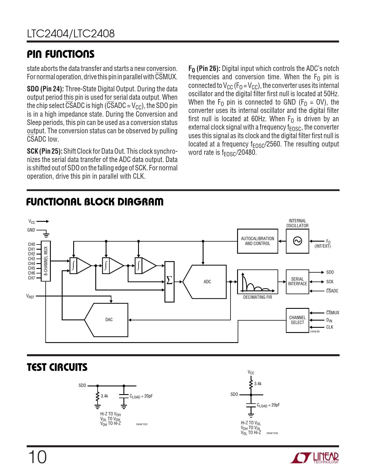 LTC2404/LTC2408 UUUPIN FUNCTIONS state aborts the data transfer and starts a new conversion. FO (Pin 26): Digital input which controls the ADC’s notch For normal operation, drive this pin in parallel with CSMUX. frequencies and conversion time. When the FO pin is connected to V SDO (Pin 24): Three-State Digital Output. During the data CC (FO = VCC), the converter uses its internal oscillator and the digital filter first null is located at 50Hz. output period this pin is used for serial data output. When When the F the chip select CSADC is high (CSADC = V O pin is connected to GND (FO = OV), the CC), the SDO pin converter uses its internal oscillator and the digital filter is in a high impedance state. During the Conversion and first null is located at 60Hz. When F Sleep periods, this pin can be used as a conversion status O is driven by an external clock signal with a frequency f output. The conversion status can be observed by pulling EOSC, the converter uses this signal as its clock and the digital filter first null is CSADC low. located at a frequency fEOSC/2560. The resulting output SCK (Pin 25): Shift Clock for Data Out. This clock synchro- word rate is fEOSC/20480. nizes the serial data transfer of the ADC data output. Data is shifted out of SDO on the falling edge of SCK. For normal operation, drive this pin in parallel with CLK. UUWFU CTIO AL BLOCK DIAGRA V INTERNAL CC OSCILLATOR GND AUTOCALIBRATION F AND CONTROL O CH0 (INT/EXT) CH1 CH2 CH3 CH4 CH5 ∫ ∫ ∫ CH6 8-CHANNEL MUX SDO CH7 SERIAL ∑ ADC SCK INTERFACE CSADC VREF DECIMATING FIR CSMUX CHANNEL DAC D SELECT IN CLK 24048 BD TEST CIRCUITS VCC SDO 3.4k 3.4k C SDO LOAD = 20pF CLOAD = 20pF Hi-Z TO VOH VOL TO VOH V Hi-Z TO V 24048 TC01 OH TO Hi-Z OL VOH TO VOL V 24048 TC02 OL TO Hi-Z 10