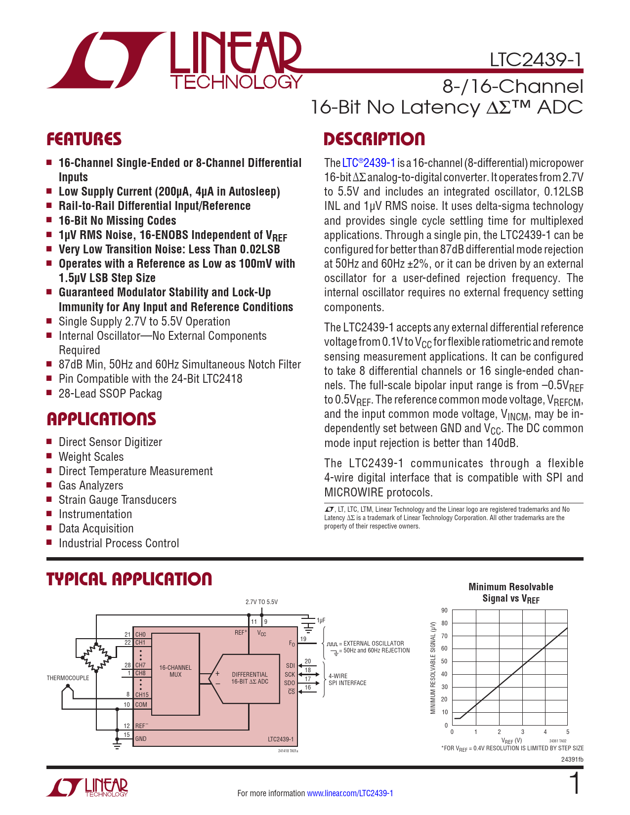 LTC2439-1 8-/16-Channel 16-Bit No Latency ∆Σ™ ADC FEATURESDESCRIPTION n 16-Channel Single-Ended or 8-Channel Differential The LTC®2439-1 is a 16-channel (8-differential) micropower Inputs 16-bit ∆Σ analog-to-digital converter. It operates from 2.7V n Low Supply Current (200µA, 4µA in Autosleep) to 5.5V and includes an integrated oscillator, 0.12LSB n Rail-to-Rail Differential Input/Reference INL and 1µV RMS noise. It uses delta-sigma technology n 16-Bit No Missing Codes and provides single cycle settling time for multiplexed n 1µV RMS Noise, 16-ENOBS Independent of VREF applications. Through a single pin, the LTC2439-1 can be n Very Low Transition Noise: Less Than 0.02LSB configured for better than 87dB differential mode rejection n Operates with a Reference as Low as 100mV with at 50Hz and 60Hz ±2%, or it can be driven by an external 1.5µV LSB Step Size oscillator for a user-defined rejection frequency. The n Guaranteed Modulator Stability and Lock-Up internal oscillator requires no external frequency setting Immunity for Any Input and Reference Conditions components. n Single Supply 2.7V to 5.5V Operation The LTC2439-1 accepts any external differential reference n Internal Oscillator—No External Components voltage from 0.1V to VCC for flexible ratiometric and remote Required sensing measurement applications. It can be configured n 87dB Min, 50Hz and 60Hz Simultaneous Notch Filter to take 8 differential channels or 16 single-ended chan- n Pin Compatible with the 24-Bit LTC2418 nels. The full-scale bipolar input range is from –0.5VREF n 28-Lead SSOP Packag to 0.5VREF. The reference common mode voltage, VREFCM, and the input common mode voltage, VINCM, may be in- APPLICATIONS dependently set between GND and VCC. The DC common n Direct Sensor Digitizer mode input rejection is better than 140dB. n Weight Scales The LTC2439-1 communicates through a flexible n Direct Temperature Measurement 4-wire digital interface that is compatible with SPI and n Gas Analyzers MICROWIRE protocols. n Strain Gauge Transducers L, LT, LTC, LTM, Linear Technology and the Linear logo are registered trademarks and No n Instrumentation Latency ∆Σ is a trademark of Linear Technology Corporation. All other trademarks are the n Data Acquisition property of their respective owners. n Industrial Process Control TYPICAL APPLICATIONMinimum ResolvableSignal vs V 2.7V TO 5.5V REF 90 11 9 1µF 80 REF+ V 21 CH0 CC 19 70 22 CH1 FO = EXTERNAL OSCILLATOR • = 50Hz and 60Hz REJECTION 60 • • 20 50 28 CH7 SDI 16-CHANNEL 18 1 CH8 MUX + DIFFERENTIAL SCK 40 THERMOCOUPLE 17 4-WIRE • 16-BIT ∆Σ ADC • – SDO SPI INTERFACE 16 • 30 CS 8 CH15 20 10 COM MINIMUM RESOLVABLE SIGNAL (µV) 10 12 REF– 0 15 0 1 2 3 4 5 GND LTC2439-1 VREF (V) 24361 TA02 *FOR V 241418 TA01a REF = 0.4V RESOLUTION IS LIMITED BY STEP SIZE 24391fb For more information www.linear.com/LTC2439-1 1 Document Outline Features Applications Typical Application Absolute Maximum Ratings Order Information Electrical Characteristics Converter Characteristics Analog Input and Reference Digital Inputs and Digital Outputs POWER REQUIREMENTS Timing Characteristics Pin Functions FUNCTIONAL Block Diagram Test CircuitS Applications Information Package Description Revision History Typical Application Related Parts
