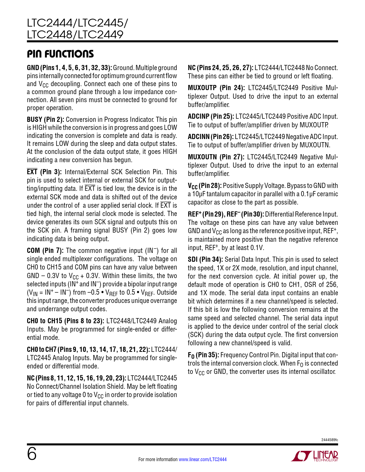 LTC2444/LTC2445/ LTC2448/LTC2449 pin FuncTions GND (Pins 1, 4, 5, 6, 31, 32, 33): Ground. Multiple ground NC (Pins 24, 25, 26, 27): LTC2444/LTC2448 No Connect. pins internally connected for optimum ground current flow These pins can either be tied to ground or left floating. and VCC decoupling. Connect each one of these pins to a common ground plane through a low impedance con- MUXOUTP (Pin 24): LTC2445/LTC2449 Positive Mul- nection. All seven pins must be connected to ground for tiplexer Output. Used to drive the input to an external proper operation. buffer/amplifier. BUSY (Pin 2): Conversion in Progress Indicator. This pin ADCINP (Pin 25): LTC2445/LTC2449 Positive ADC Input. is HIGH while the conversion is in progress and goes LOW Tie to output of buffer/amplifier driven by MUXOUTP. indicating the conversion is complete and data is ready. ADCINN (Pin 26): LTC2445/LTC2449 Negative ADC Input. It remains LOW during the sleep and data output states. Tie to output of buffer/amplifier driven by MUXOUTN. At the conclusion of the data output state, it goes HIGH indicating a new conversion has begun. MUXOUTN (Pin 27): LTC2445/LTC2449 Negative Mul- tiplexer Output. Used to drive the input to an external EXT (Pin 3): Internal/External SCK Selection Pin. This buffer/amplifier. pin is used to select internal or external SCK for output- ting/inputting data. If EXT is tied low, the device is in the VCC (Pin 28): Positive Supply Voltage. Bypass to GND with external SCK mode and data is shifted out of the device a 10µF tantalum capacitor in parallel with a 0.1µF ceramic under the control of a user applied serial clock. If EXT is capacitor as close to the part as possible. tied high, the internal serial clock mode is selected. The REF+ (Pin 29), REF– (Pin 30): Differential Reference Input. device generates its own SCK signal and outputs this on The voltage on these pins can have any value between the SCK pin. A framing signal BUSY (Pin 2) goes low GND and VCC as long as the reference positive input, REF+, indicating data is being output. is maintained more positive than the negative reference COM (Pin 7): The common negative input (IN–) for all input, REF+, by at least 0.1V. single ended multiplexer configurations. The voltage on SDI (Pin 34): Serial Data Input. This pin is used to select CH0 to CH15 and COM pins can have any value between the speed, 1X or 2X mode, resolution, and input channel, GND – 0.3V to VCC + 0.3V. Within these limits, the two for the next conversion cycle. At initial power up, the selected inputs (IN+ and IN–) provide a bipolar input range default mode of operation is CH0 to CH1, OSR of 256, (VIN = IN+ – IN–) from –0.5 • VREF to 0.5 • VREF. Outside and 1X mode. The serial data input contains an enable this input range, the converter produces unique overrange bit which determines if a new channel/speed is selected. and underrange output codes. If this bit is low the following conversion remains at the CH0 to CH15 (Pins 8 to 23): LTC2448/LTC2449 Analog same speed and selected channel. The serial data input Inputs. May be programmed for single-ended or differ- is applied to the device under control of the serial clock ential mode. (SCK) during the data output cycle. The first conversion following a new channel/speed is valid. CH0 to CH7 (Pins 9, 10, 13, 14, 17, 18, 21, 22): LTC2444/ LTC2445 Analog Inputs. May be programmed for single- FO (Pin 35): Frequency Control Pin. Digital input that con- ended or differential mode. trols the internal conversion clock. When FO is connected to VCC or GND, the converter uses its internal oscillator. NC (Pins 8, 11, 12, 15, 16, 19, 20, 23): LTC2444/LTC2445 No Connect/Channel Isolation Shield. May be left floating or tied to any voltage 0 to VCC in order to provide isolation for pairs of differential input channels. 2444589fc 6 For more information www.linear.com/LTC2444 Document Outline Features Description Applications Typical Application Absolute Maximum Ratings Pin Configuration Order Information Electrical Characteristics Analog Input and Reference Digital Inputs and Digital Outputs Power Requirements Timing Characteristics Pin Functions Functional Block Diagram Test Circuit Applications Information Package Description Revision History Typical Application Related Parts
