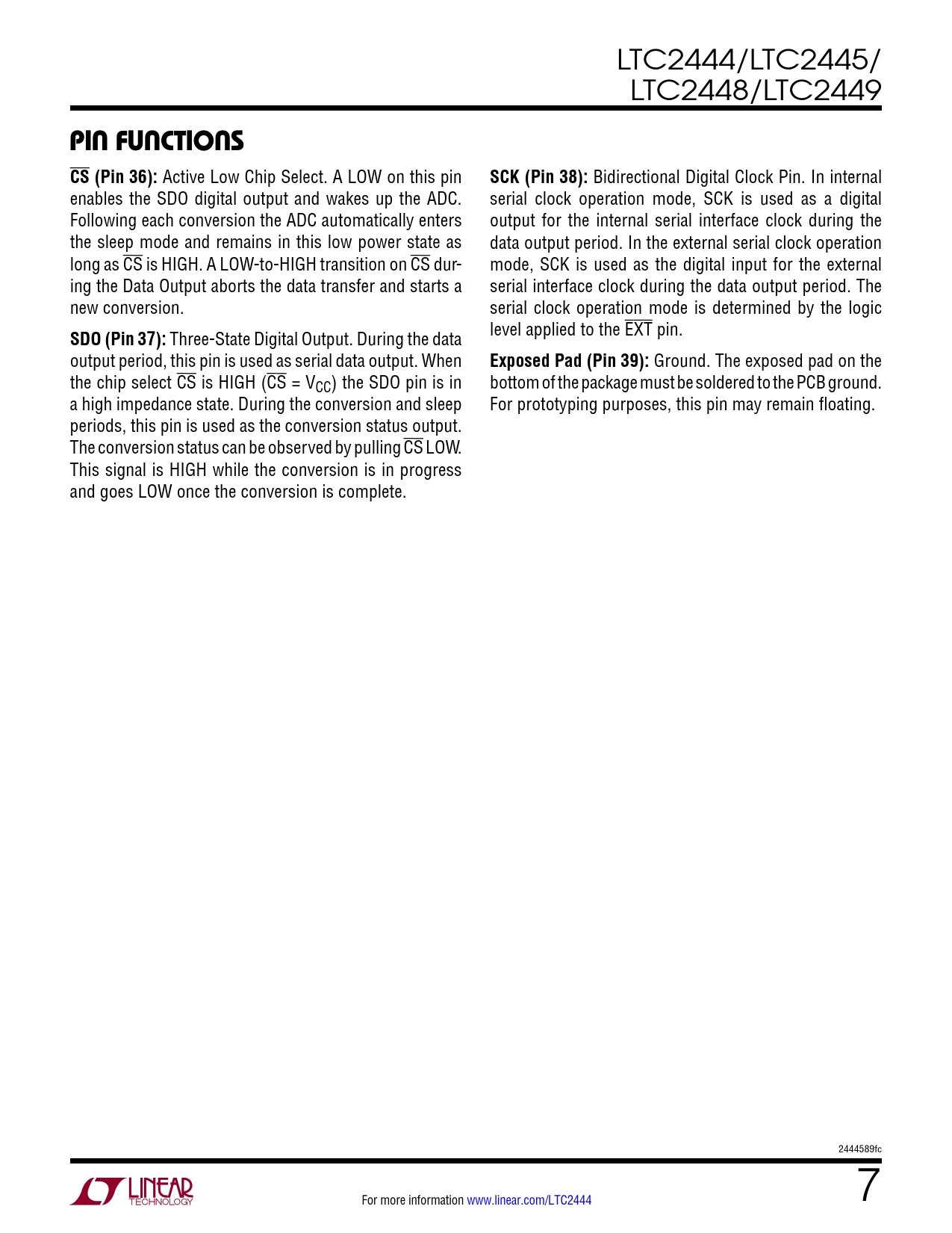 LTC2444/LTC2445/ LTC2448/LTC2449 pin FuncTionsCS (Pin 36): Active Low Chip Select. A LOW on this pin SCK (Pin 38): Bidirectional Digital Clock Pin. In internal enables the SDO digital output and wakes up the ADC. serial clock operation mode, SCK is used as a digital Following each conversion the ADC automatically enters output for the internal serial interface clock during the the sleep mode and remains in this low power state as data output period. In the external serial clock operation long as CS is HIGH. A LOW-to-HIGH transition on CS dur- mode, SCK is used as the digital input for the external ing the Data Output aborts the data transfer and starts a serial interface clock during the data output period. The new conversion. serial clock operation mode is determined by the logic SDO (Pin 37): Three-State Digital Output. During the data level applied to the EXT pin. output period, this pin is used as serial data output. When Exposed Pad (Pin 39): Ground. The exposed pad on the the chip select CS is HIGH (CS = VCC) the SDO pin is in bottom of the package must be soldered to the PCB ground. a high impedance state. During the conversion and sleep For prototyping purposes, this pin may remain floating. periods, this pin is used as the conversion status output. The conversion status can be observed by pulling CS LOW. This signal is HIGH while the conversion is in progress and goes LOW once the conversion is complete. 2444589fc For more information www.linear.com/LTC2444 7 Document Outline Features Description Applications Typical Application Absolute Maximum Ratings Pin Configuration Order Information Electrical Characteristics Analog Input and Reference Digital Inputs and Digital Outputs Power Requirements Timing Characteristics Pin Functions Functional Block Diagram Test Circuit Applications Information Package Description Revision History Typical Application Related Parts