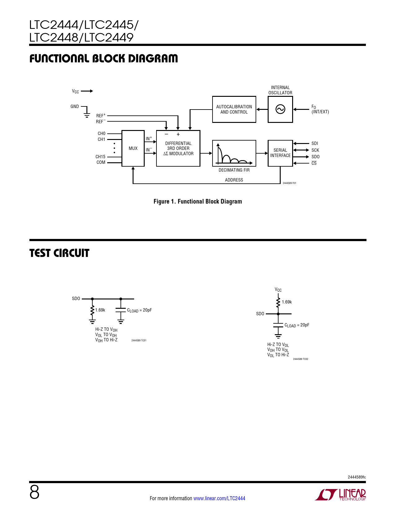 VCC SDO 1.69k 1.69k CLOAD = 20pF SDO CLOAD = 20pF Hi-Z TO VOH VOL TO VOH V 2444589 TC01 OH TO Hi-Z Hi-Z TO VOL VOH TO VOL VOL TO Hi-Z 2444589 TC02 2444589fc 8 For more information www.linear.com/LTC2444 Document Outline Features Description Applications Typical Application Absolute Maximum Ratings Pin Configuration Order Information Electrical Characteristics Analog Input and Reference Digital Inputs and Digital Outputs Power Requirements Timing Characteristics Pin Functions Functional Block Diagram Test Circuit Applications Information Package Description Revision History Typical Application Related Parts