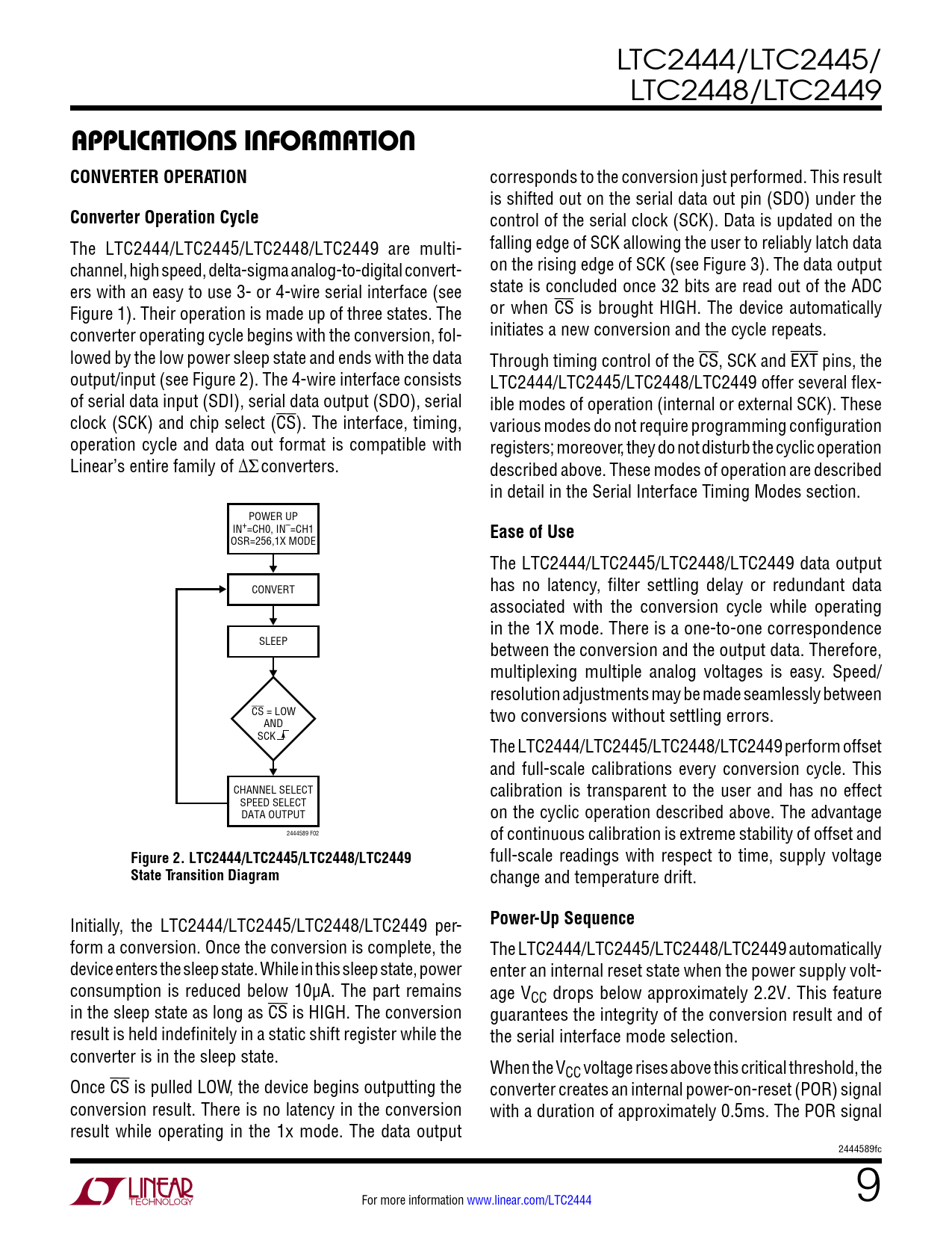 LTC2444/LTC2445/ LTC2448/LTC2449 applicaTions inForMaTionCONVERTER OPERATION corresponds to the conversion just performed. This result is shifted out on the serial data out pin (SDO) under the Converter Operation Cycle control of the serial clock (SCK). Data is updated on the The LTC2444/LTC2445/LTC2448/LTC2449 are multi- falling edge of SCK allowing the user to reliably latch data channel, high speed, delta-sigma analog-to-digital convert- on the rising edge of SCK (see Figure 3). The data output ers with an easy to use 3- or 4-wire serial interface (see state is concluded once 32 bits are read out of the ADC Figure 1). Their operation is made up of three states. The or when CS is brought HIGH. The device automatically converter operating cycle begins with the conversion, fol- initiates a new conversion and the cycle repeats. lowed by the low power sleep state and ends with the data Through timing control of the CS, SCK and EXT pins, the output/input (see Figure 2). The 4-wire interface consists LTC2444/LTC2445/LTC2448/LTC2449 offer several flex- of serial data input (SDI), serial data output (SDO), serial ible modes of operation (internal or external SCK). These clock (SCK) and chip select (CS). The interface, timing, various modes do not require programming configuration operation cycle and data out format is compatible with registers; moreover, they do not disturb the cyclic operation Linear’s entire family of ∆Σ converters. described above. These modes of operation are described in detail in the Serial Interface Timing Modes section. POWER UP IN+=CH0, IN–=CH1 Ease of Use OSR=256,1X MODE The LTC2444/LTC2445/LTC2448/LTC2449 data output CONVERT has no latency, filter settling delay or redundant data associated with the conversion cycle while operating in the 1X mode. There is a one-to-one correspondence SLEEP between the conversion and the output data. Therefore, multiplexing multiple analog voltages is easy. Speed/ resolution adjustments may be made seamlessly between CS = LOW two conversions without settling errors. AND SCK The LTC2444/LTC2445/LTC2448/LTC2449 perform offset and full-scale calibrations every conversion cycle. This CHANNEL SELECT calibration is transparent to the user and has no effect SPEED SELECT DATA OUTPUT on the cyclic operation described above. The advantage 2444589 F02 of continuous calibration is extreme stability of offset and Figure 2. LTC2444/LTC2445/LTC2448/LTC2449 full-scale readings with respect to time, supply voltage State Transition Diagram change and temperature drift. Power-Up Sequence Initially, the LTC2444/LTC2445/LTC2448/LTC2449 per- form a conversion. Once the conversion is complete, the The LTC2444/LTC2445/LTC2448/LTC2449 automatically device enters the sleep state. While in this sleep state, power enter an internal reset state when the power supply volt- consumption is reduced below 10µA. The part remains age VCC drops below approximately 2.2V. This feature in the sleep state as long as CS is HIGH. The conversion guarantees the integrity of the conversion result and of result is held indefinitely in a static shift register while the the serial interface mode selection. converter is in the sleep state. When the VCC voltage rises above this critical threshold, the Once CS is pulled LOW, the device begins outputting the converter creates an internal power-on-reset (POR) signal conversion result. There is no latency in the conversion with a duration of approximately 0.5ms. The POR signal result while operating in the 1x mode. The data output 2444589fc For more information www.linear.com/LTC2444 9 Document Outline Features Description Applications Typical Application Absolute Maximum Ratings Pin Configuration Order Information Electrical Characteristics Analog Input and Reference Digital Inputs and Digital Outputs Power Requirements Timing Characteristics Pin Functions Functional Block Diagram Test Circuit Applications Information Package Description Revision History Typical Application Related Parts