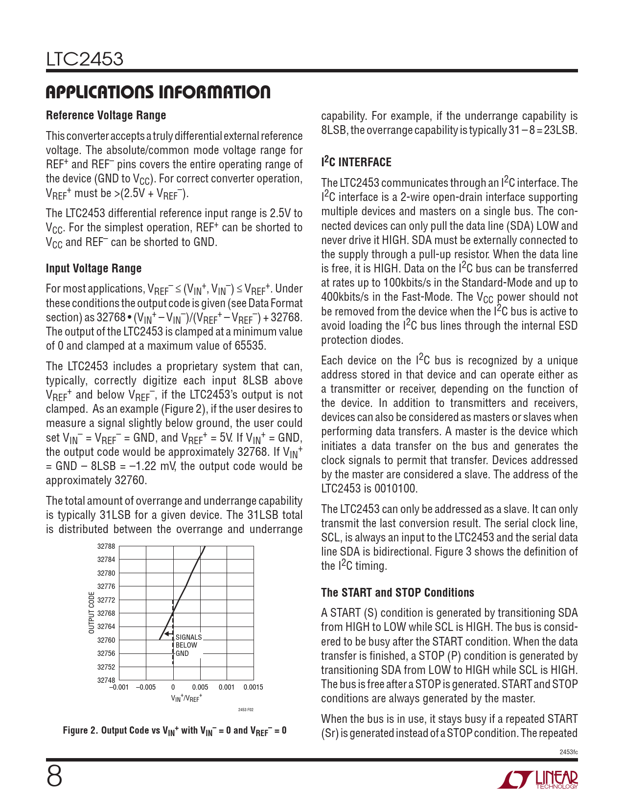 is free, it is HIGH. Data on the I2C bus can be transferred For most applications, V – + – + at rates up to 100kbits/s in the Standard-Mode and up to REF ≤ (VIN , VIN ) ≤ VREF . Under these conditions the output code is given (see Data Format 400kbits/s in the Fast-Mode. The VCC power should not section) as 32768 • (V + – + – be removed from the device when the I2C bus is active to IN – VIN )/(VREF – VREF ) + 32768. The output of the LTC2453 is clamped at a minimum value avoid loading the I2C bus lines through the internal ESD of 0 and clamped at a maximum value of 65535. protection diodes. The LTC2453 includes a proprietary system that can, Each device on the I2C bus is recognized by a unique typically, correctly digitize each input 8LSB above address stored in that device and can operate either as V + – a transmitter or receiver, depending on the function of REF and below VREF , if the LTC2453’s output is not clamped. As an example (Figure 2), if the user desires to the device. In addition to transmitters and receivers, measure a signal slightly below ground, the user could devices can also be considered as masters or slaves when set V – – + + performing data transfers. A master is the device which IN = VREF = GND, and VREF = 5V. If VIN = GND, the output code would be approximately 32768. If V + initiates a data transfer on the bus and generates the IN = GND – 8LSB = –1.22 mV, the output code would be clock signals to permit that transfer. Devices addressed approximately 32760. by the master are considered a slave. The address of the LTC2453 is 0010100. The total amount of overrange and underrange capability is typically 31LSB for a given device. The 31LSB total The LTC2453 can only be addressed as a slave. It can only is distributed between the overrange and underrange transmit the last conversion result. The serial clock line, SCL, is always an input to the LTC2453 and the serial data 32788 line SDA is bidirectional. Figure 3 shows the definition of 32784 the I2C timing. 32780 32776