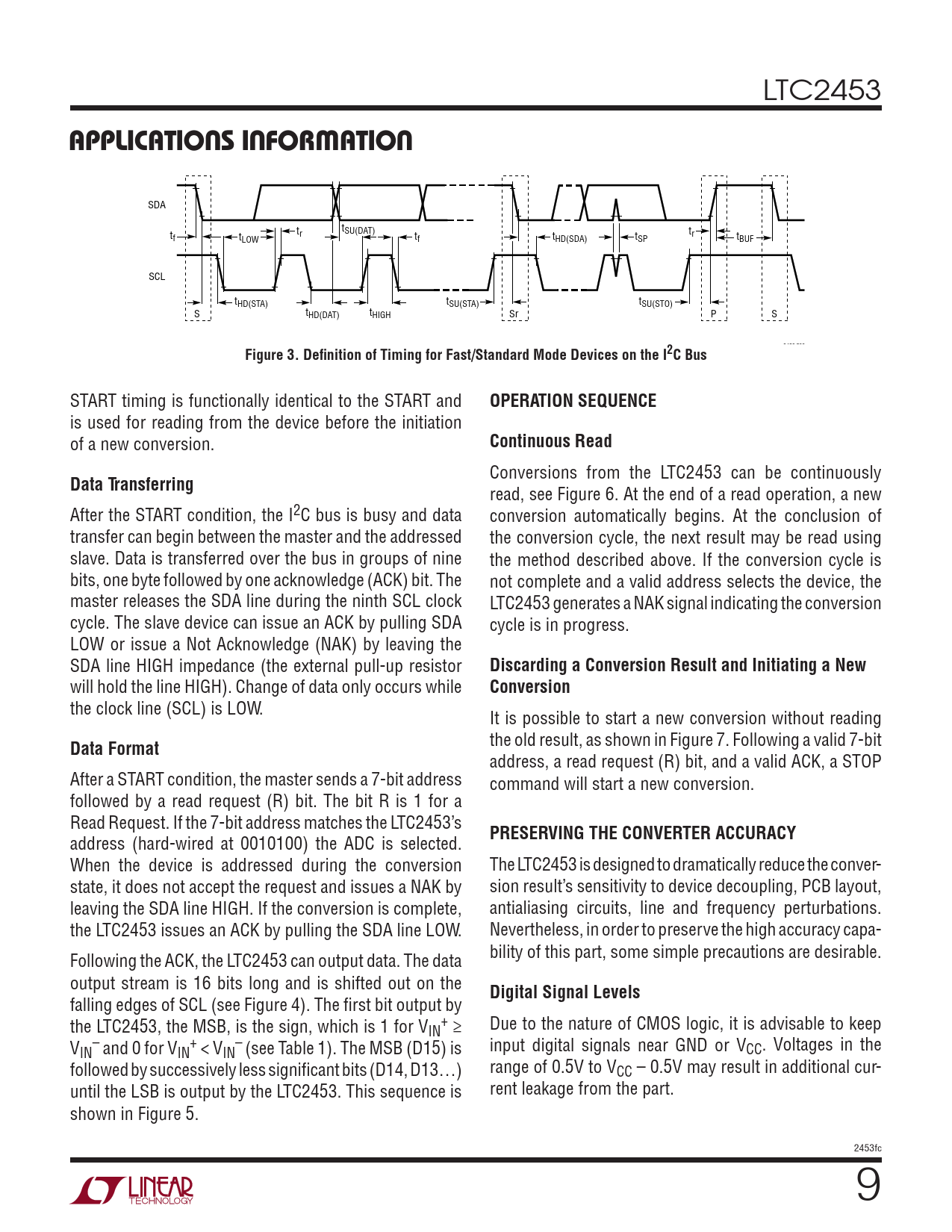 LTC2453 APPLICATIONS INFORMATION SDA t t SU(DAT) tf t r tr LOW tf tHD(SDA) tSP tBUF SCL tHD(STA) tSU(STA) tSU(STO) S tHD(DAT) tHIGH Sr P S 2453 F03 Figure 3. Definition of Timing for Fast/Standard Mode Devices on the I2C Bus START timing is functionally identical to the START and OPERATION SEQUENCE is used for reading from the device before the initiation of a new conversion. Continuous Read Conversions from the LTC2453 can be continuously Data Transferring read, see Figure 6. At the end of a read operation, a new After the START condition, the I2C bus is busy and data conversion automatically begins. At the conclusion of transfer can begin between the master and the addressed the conversion cycle, the next result may be read using slave. Data is transferred over the bus in groups of nine the method described above. If the conversion cycle is bits, one byte followed by one acknowledge (ACK) bit. The not complete and a valid address selects the device, the master releases the SDA line during the ninth SCL clock LTC2453 generates a NAK signal indicating the conversion cycle. The slave device can issue an ACK by pulling SDA cycle is in progress. LOW or issue a Not Acknowledge (NAK) by leaving the SDA line HIGH impedance (the external pull-up resistor Discarding a Conversion Result and Initiating a New will hold the line HIGH). Change of data only occurs while Conversion the clock line (SCL) is LOW. It is possible to start a new conversion without reading Data Format the old result, as shown in Figure 7. Following a valid 7-bit address, a read request (R) bit, and a valid ACK, a STOP After a START condition, the master sends a 7-bit address command will start a new conversion. followed by a read request (R) bit. The bit R is 1 for a Read Request. If the 7-bit address matches the LTC2453’s address (hard-wired at 0010100) the ADC is selected. PRESERVING THE CONVERTER ACCURACY When the device is addressed during the conversion The LTC2453 is designed to dramatically reduce the conver- state, it does not accept the request and issues a NAK by sion result’s sensitivity to device decoupling, PCB layout, leaving the SDA line HIGH. If the conversion is complete, antialiasing circuits, line and frequency perturbations. the LTC2453 issues an ACK by pulling the SDA line LOW. Nevertheless, in order to preserve the high accuracy capa- Following the ACK, the LTC2453 can output data. The data bility of this part, some simple precautions are desirable. output stream is 16 bits long and is shifted out on the Digital Signal Levels falling edges of SCL (see Figure 4). The first bit output by the LTC2453, the MSB, is the sign, which is 1 for V + IN ≥ Due to the nature of CMOS logic, it is advisable to keep V – + – IN and 0 for VIN < VIN (see Table 1). The MSB (D15) is input digital signals near GND or VCC. Voltages in the followed by successively less significant bits (D14, D13…) range of 0.5V to VCC – 0.5V may result in additional cur- until the LSB is output by the LTC2453. This sequence is rent leakage from the part. shown in Figure 5. 2453fc 9 Document Outline Features Applications Description Typical Application Absolute Maximum Ratings Pin Configuration Order Information Electrical Characteristics Analog Inputs And References Power Requirements I2C Inputs And Outputs I2C Timing Characteristics Typical Performance Characteristics Pin Functions Block Diagram Applications Information Typical Application Package Description Revision History Related Parts