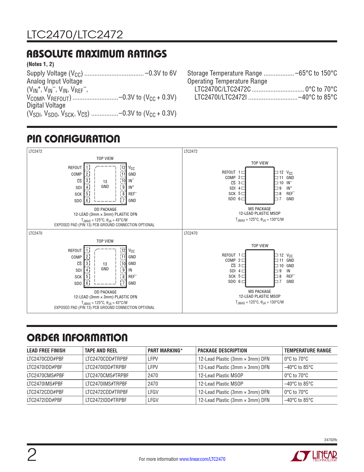 LTC2472 LTC2472 TOP VIEW TOP VIEW REFOUT 1 12 VCC COMP 2 11 GND REFOUT 1 12 VCC COMP 2 11 GND CS 3 13 10 IN– CS 3 10 IN– SDI 4 GND 9 IN+ SDI 4 9 IN+ SCK 5 8 REF– SCK 5 8 REF– SDO 6 7 GND SDO 6 7 GND DD PACKAGE MS PACKAGE 12-LEAD (3mm × 3mm) PLASTIC DFN 12-LEAD PLASTIC MSOP TJMAX = 125°C, θJA = 43°C/W TJMAX = 125°C, θJA = 130°C/W EXPOSED PAD (PIN 13) PCB GROUND CONNECTION OPTIONAL LTC2470 LTC2470 TOP VIEW TOP VIEW REFOUT 1 12 VCC COMP 2 11 GND REFOUT 1 12 VCC COMP 2 11 GND CS 3 13 10 GND CS 3 10 GND SDI 4 GND 9 IN SDI 4 9 IN SCK 5 8 REF– SCK 5 8 REF– SDO 6 7 GND SDO 6 7 GND DD PACKAGE MS PACKAGE 12-LEAD (3mm × 3mm) PLASTIC DFN 12-LEAD PLASTIC MSOP TJMAX = 125°C, θJA = 43°C/W TJMAX = 125°C, θJA = 130°C/W EXPOSED PAD (PIN 13) PCB GROUND CONNECTION OPTIONAL