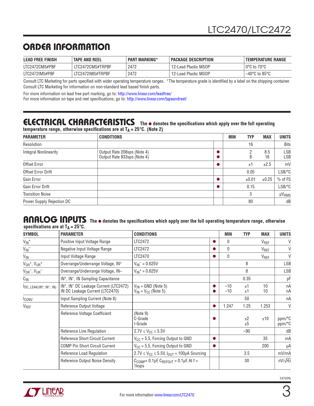 LTC2470/LTC2472 orDer inForMaTionLEAD FREE FINISHTAPE AND REELPART MARKING*PACKAGE DESCRIPTIONTEMPERATURE RANGE LTC2472CMS#PBF LTC2472CMS#TRPBF 2472 12-Lead Plastic MSOP 0°C to 70°C LTC2472IMS#PBF LTC2472IMS#TRPBF 2472 12-Lead Plastic MSOP –40°C to 85°C Consult LTC Marketing for parts specified with wider operating temperature ranges. *The temperature grade is identified by a label on the shipping container. Consult LTC Marketing for information on non-standard lead based finish parts. For more information on lead free part marking, go to: http://www.linear.com/leadfree/ For more information on tape and reel specifications, go to: http://www.linear.com/tapeandreel/ elecTrical characTerisTicsThe l denotes the specifications which apply over the full operatingtemperature range, otherwise specifications are at TA = 25°C. (Note 2) PARAMETERCONDITIONSMINTYPMAXUNITS Resolution 16 Bits Integral Nonlinearity Output Rate 208sps (Note 4) l 2 8.5 LSB Output Rate 833sps (Note 4) l 8 16 LSB Offset Error l ±1 ±2.5 mV Offset Error Drift 0.05 LSB/°C Gain Error l ±0.01 ±0.25 % of FS Gain Error Drift l 0.15 LSB/°C Transition Noise 3 µVRMS Power Supply Rejection DC 80 dB analog inpuTsThe l denotes the specifications which apply over the full operating temperature range, otherwisespecifications are at TA = 25°C.SYMBOLPARAMETERCONDITIONSMINTYPMAXUNITS V + IN Positive Input Voltage Range LTC2472 l 0 VREF V V – IN Negative Input Voltage Range LTC2472 l 0 VREF V VIN Input Voltage Range LTC2470 l 0 VREF V V + + – OR , VUR Overrange/Underrange Voltage, IN+ VIN = 0.625V 8 LSB V – – + OR , VUR Overrange/Underrange Voltage, IN– VIN = 0.625V 8 LSB CIN IN+, IN–, IN Sampling Capacitance 0.35 pF IDC_LEAK(IN+, IN–, IN) IN+, IN– DC Leakage Current (LTC2472) VIN = GND (Note 5) l –10 ±1 10 nA IN DC Leakage Current (LTC2470) VIN = VCC (Note 5) l –10 ±1 10 nA ICONV Input Sampling Current (Note 8) 50 nA VREF Reference Output Voltage l 1.247 1.25 1.253 V Reference Voltage Coefficient (Note 9) C-Grade l ±2 ±10 ppm/°C I-Grade ±5 ppm/°C Reference Line Regulation 2.7V ≤ VCC ≤ 5.5V –90 dB Reference Short Circuit Current VCC = 5.5, Forcing Output to GND l 35 mA COMP Pin Short Circuit Current VCC = 5.5, Forcing Output to GND l 200 µA Reference Load Regulation 2.7V ≤ VCC ≤ 5.5V, IOUT = 100μA Sourcing 3.5 mV/mA Reference Output Noise Density CCOMP= 0.1μF, CREFOUT = 0.1μF, At f = 30 nV/√Hz 1ksps 24702fb For more information www.linear.com/LTC2470 3 Document Outline Features Description Applications Typical Application Absolute Maximum Ratings Pin Configuration Order Information Electrical Characteristics Analog Inputs Power Requirements Digital Inputs and Digital Outputs Timing Characteristics Typical Performance Characteristics Pin Functions Block Diagram Applications Information Package Description Revision History Typical Application Related Parts