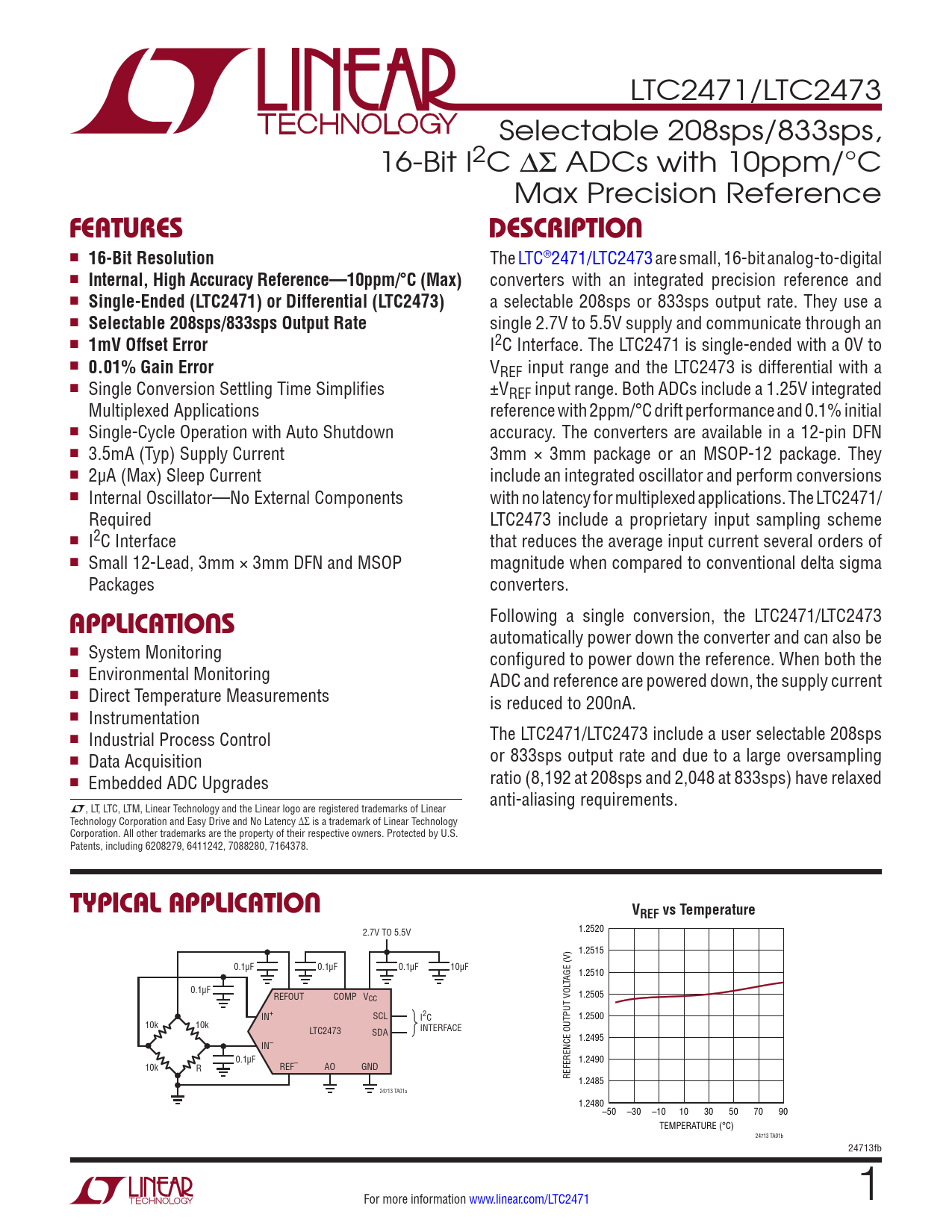 LTC2471/LTC2473 Selectable 208sps/833sps, 16-Bit I2C ΔΣ ADCs with 10ppm/°C Max Precision Reference