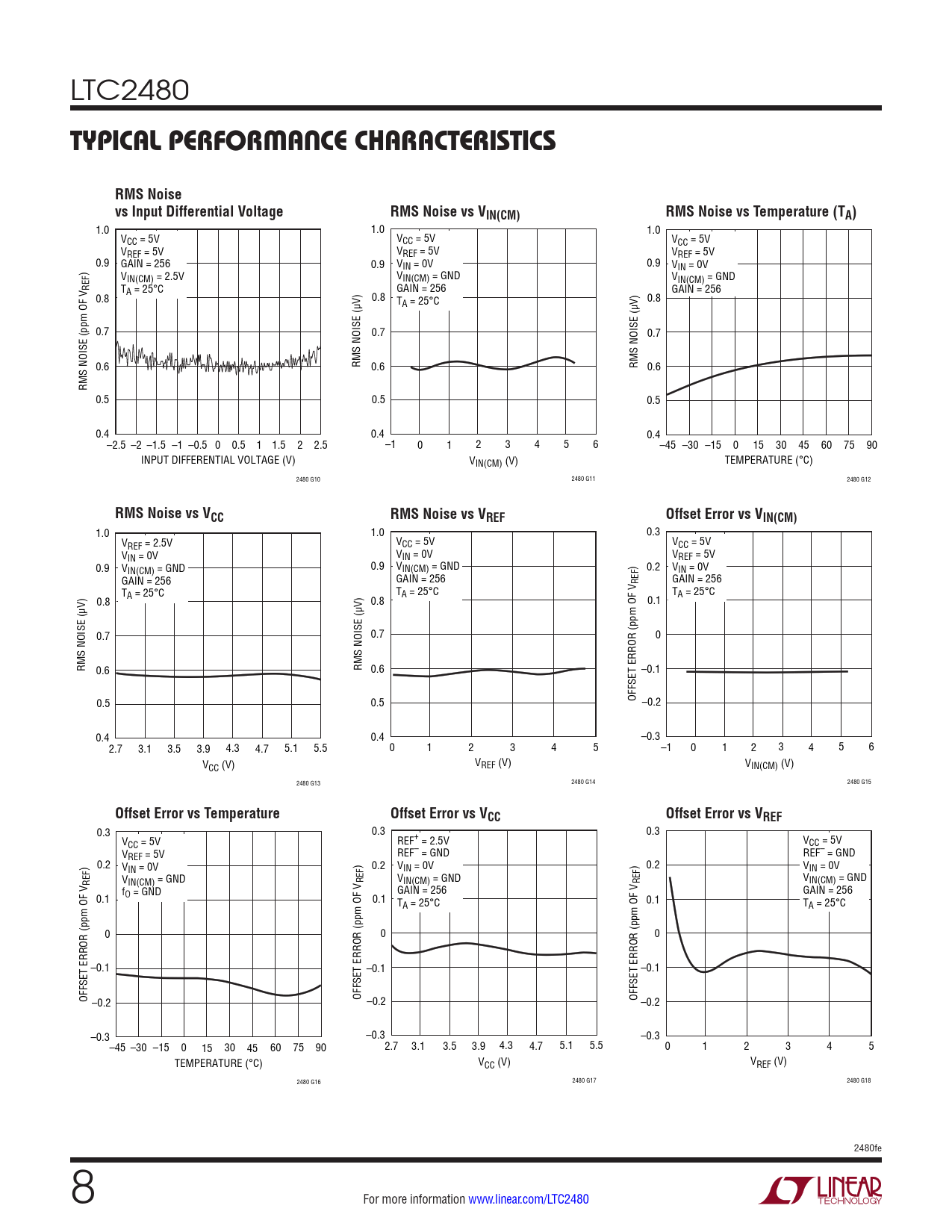 1.0 1.0 1.0 VCC = 5V VCC = 5V VCC = 5V VREF = 5V VREF = 5V VREF = 5V 0.9 GAIN = 256 0.9 V 0.9 V ) IN = 0V IN = 0V VIN(CM) = 2.5V VIN(CM) = GND VIN(CM) = GND REF T GAIN = 256 GAIN = 256 0.8 A = 25°C 0.8 TA = 25°C 0.8 0.7 0.7 0.7 0.6 RMS NOISE (µV) 0.6 RMS NOISE (µV) 0.6 RMS NOISE (ppm OF V 0.5 0.5 0.5 0.4 0.4 0.4 –2.5 –2 –1.5 –1 –0.5 0 0.5 1 1.5 2 2.5 –1 0 1 2 3 4 5 6 –45 –30 –15 0 15 30 45 60 75 90 INPUT DIFFERENTIAL VOLTAGE (V) VIN(CM) (V) TEMPERATURE (°C) 2480 G10 2480 G11 2480 G12
