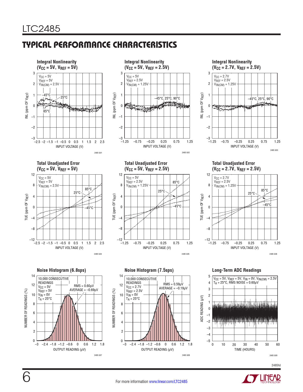 3 3 3 VCC = 5V VCC = 5V VCC = 2.7V VREF = 5V VREF = 2.5V VREF = 2.5V 2 VIN(CM) = 2.5V 2 VIN(CM) = 1.25V 2 VIN(CM) = 1.25V ) 1 –45°C 1 1 REF 25°C REF –45°C, 25°C, 90°C REF –45°C, 25°C, 90°C 0 0 0 85°C INL (ppm OF V –1 INL (ppm OF V –1 INL (ppm OF V –1 –2 –2 –2 –3 –3 –3 –2.5 –2 –1.5 –1 –0.5 0 0.5 1 1.5 2 2.5 –1.25 –0.75 –0.25 0.25 0.75 1.25 –1.25 –0.75 –0.25 0.25 0.75 1.25 INPUT VOLTAGE (V) INPUT VOLTAGE (V) INPUT VOLTAGE (V) 2485 G03 2485 G01 2485 G02