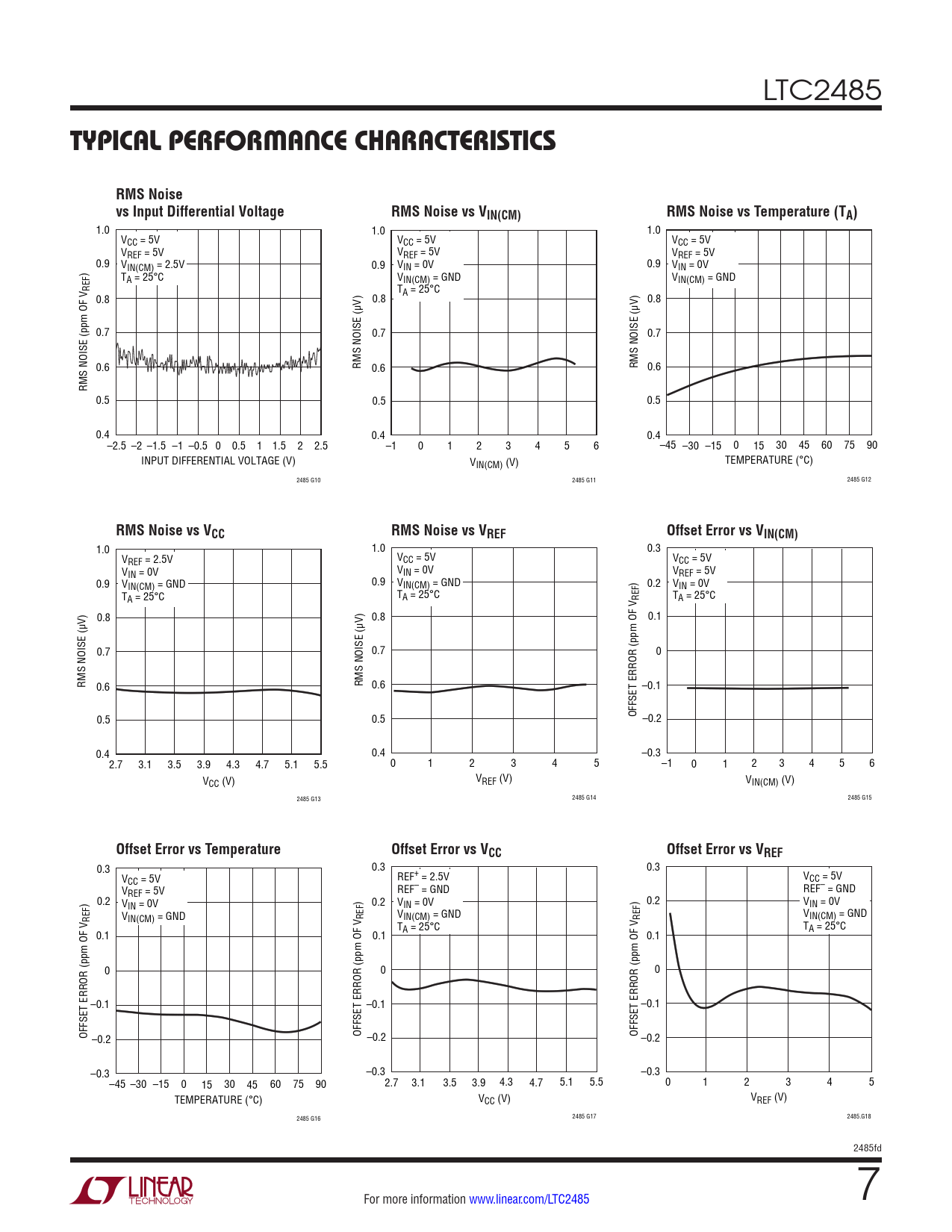 1.0 1.0 1.0 VCC = 5V VCC = 5V VCC = 5V VREF = 5V VREF = 5V VREF = 5V 0.9 V 0.9 V 0.9 V ) IN(CM) = 2.5V IN = 0V IN = 0V TA = 25°C VIN(CM) = GND VIN(CM) = GND REF TA = 25°C 0.8 0.8 0.8 0.7 0.7 0.7 0.6 RMS NOISE (µV) 0.6 RMS NOISE (µV) 0.6 RMS NOISE (ppm OF V 0.5 0.5 0.5 0.4 0.4 0.4 –2.5 –2 –1.5 –1 –0.5 0 0.5 1 1.5 2 2.5 –1 0 1 2 3 4 5 6 –45 –30 –15 0 15 30 45 60 75 90 INPUT DIFFERENTIAL VOLTAGE (V) VIN(CM) (V) TEMPERATURE (°C) 2485 G10 2485 G11 2485 G12