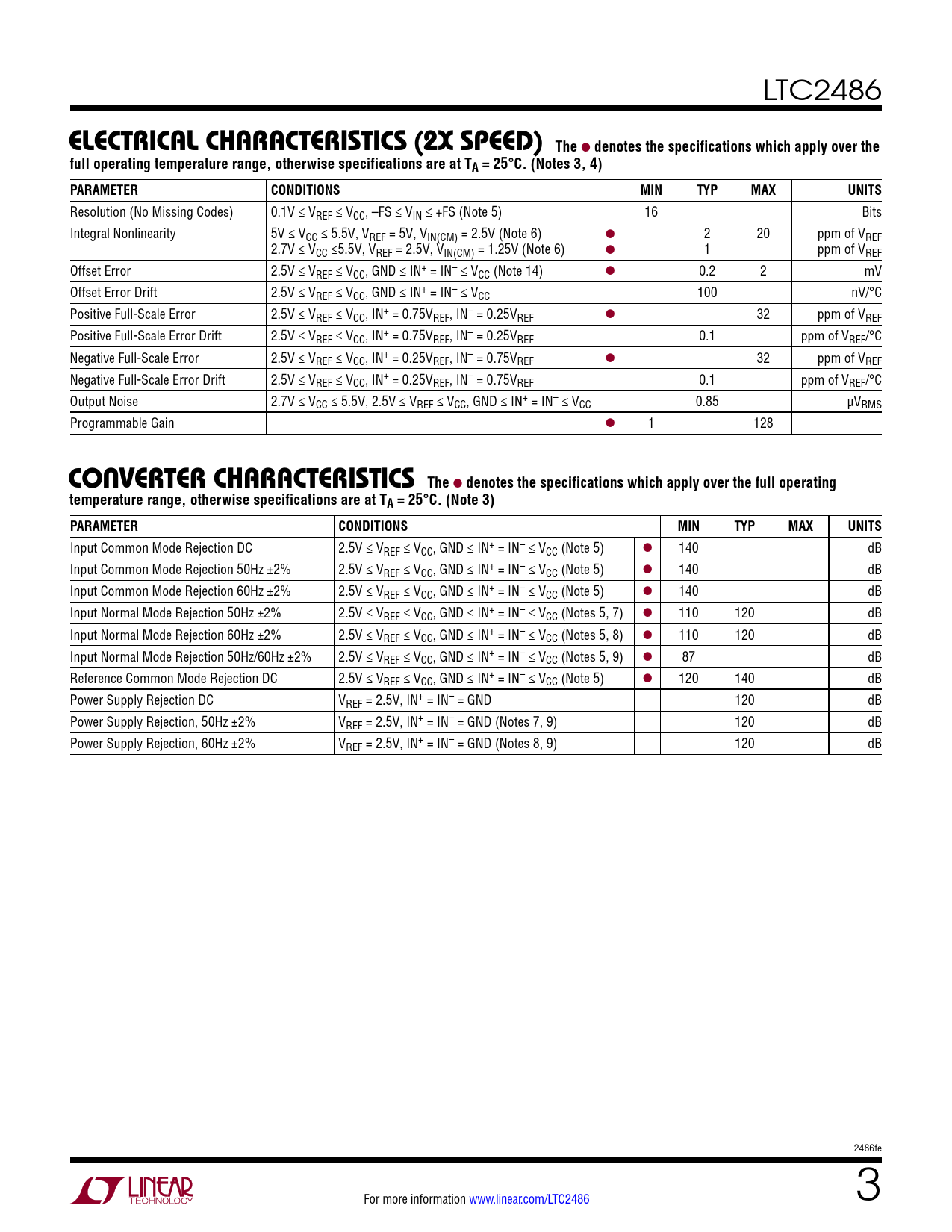 Input Common Mode Rejection DC 2.5V ≤ VREF ≤ VCC, GND ≤ IN+ = IN– ≤ VCC (Note 5) l 140 dB Input Common Mode Rejection 50Hz ±2% 2.5V ≤ VREF ≤ VCC, GND ≤ IN+ = IN– ≤ VCC (Note 5) l 140 dB Input Common Mode Rejection 60Hz ±2% 2.5V ≤ VREF ≤ VCC, GND ≤ IN+ = IN– ≤ VCC (Note 5) l 140 dB Input Normal Mode Rejection 50Hz ±2% 2.5V ≤ VREF ≤ VCC, GND ≤ IN+ = IN– ≤ VCC (Notes 5, 7) l 110 120 dB Input Normal Mode Rejection 60Hz ±2% 2.5V ≤ VREF ≤ VCC, GND ≤ IN+ = IN– ≤ VCC (Notes 5, 8) l 110 120 dB Input Normal Mode Rejection 50Hz/60Hz ±2% 2.5V ≤ VREF ≤ VCC, GND ≤ IN+ = IN– ≤ VCC (Notes 5, 9) l 87 dB Reference Common Mode Rejection DC 2.5V ≤ VREF ≤ VCC, GND ≤ IN+ = IN– ≤ VCC (Note 5) l 120 140 dB Power Supply Rejection DC VREF = 2.5V, IN+ = IN– = GND 120 dB Power Supply Rejection, 50Hz ±2% VREF = 2.5V, IN+ = IN– = GND (Notes 7, 9) 120 dB Power Supply Rejection, 60Hz ±2% VREF = 2.5V, IN+ = IN– = GND (Notes 8, 9) 120 dB 2486fe For more information www.linear.com/LTC2486 3 Document Outline Features Applications Description Typical Application Absolute Maximum Ratings Pin Configuration Order Information Electrical Characteristics (Normal Speed) Electrical Characteristics (2x Speed) Converter Characteristics Analog Input and Reference Digital Inputs and Digital Outputs Power Requirements Typical Performance Characteristics Pin Functions Functional Block Diagram Test Circuits Timing Diagrams Applications Information Package Description Revision History Typical Application Related Parts