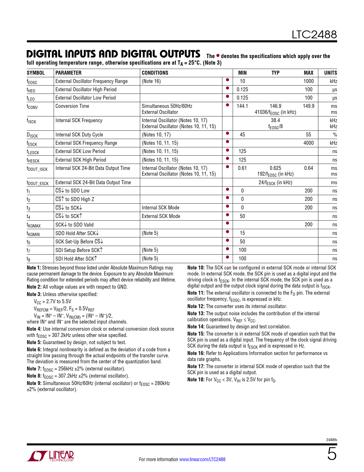 LTC2488 DIGITALINPUTS AND DIGITAL OUTPUTS The l denotes the specifications which apply over thefull operating temperature range, otherwise specifications are at TA = 25°C. (Note 3) SYMBOLPARAMETERCONDITIONSMINTYPMAXUNITS fEOSC External Oscillator Frequency Range (Note 16) l 10 1000 kHz tHEO External Oscillator High Period l 0.125 100 µs tLEO External Oscillator Low Period l 0.125 100 µs t l CONV Conversion Time Simultaneous 50Hz/60Hz 144.1 146.9 149.9 ms External Oscillator 41036/fEOSC (in kHz) ms fISCK Internal SCK Frequency Internal Oscillator (Notes 10, 17) 38.4 kHz External Oscillator (Notes 10, 11, 15) fEOSC/8 kHz DISCK Internal SCK Duty Cycle (Notes 10, 17) l 45 55 % fESCK External SCK Frequency Range (Notes 10, 11, 15) l 4000 kHz tLESCK External SCK Low Period (Notes 10, 11, 15) l 125 ns tHESCK External SCK High Period (Notes 10, 11, 15) l 125 ns t l DOUT_ISCK Internal SCK 24-Bit Data Output Time Internal Oscillator (Notes 10, 17) 0.61 0.625 0.64 ms External Oscillator (Notes 10, 11, 15) 192/fEOSC (in kHz) ms tDOUT_ESCK External SCK 24-Bit Data Output Time 24/fESCK (in kHz) ms t1 CS↓ to SDO Low l 0 200 ns t2 CS↑ to SDO High Z l 0 200 ns t3 CS↓ to SCK↓ Internal SCK Mode l 0 200 ns t4 CS↓ to SCK↑ External SCK Mode l 50 ns tKQMAX SCK↓ to SDO Valid l 200 ns tKQMIN SDO Hold After SCK↓ (Note 5) l 15 ns t5 SCK Set-Up Before CS↓ l 50 ns t7 SDI Setup Before SCK↑ (Note 5) l 100 ns t8 SDI Hold After SCK↑ (Note 5) l 100 ns Note 1: Stresses beyond those listed under Absolute Maximum Ratings may Note 10: The SCK can be configured in external SCK mode or internal SCK cause permanent damage to the device. Exposure to any Absolute Maximum mode. In external SCK mode, the SCK pin is used as a digital input and the Rating condition for extended periods may affect device reliability and lifetime. driving clock is fESCK. In the internal SCK mode, the SCK pin is used as a Note 2: All voltage values are with respect to GND. digital output and the output clock signal during the data output is fISCK. Note 3: Unless otherwise specified: Note 11: The external oscillator is connected to the FO pin. The external V oscillator frequency, f CC = 2.7V to 5.5V EOSC, is expressed in kHz. V Note 12: The converter uses its internal oscillator. REFCM = VREF/2, FS = 0.5VREF V Note 13: The output noise includes the contribution of the internal IN = IN+ – IN–, VIN(CM) = (IN+ – IN–)/2, where IN+ and IN– are the selected input channels. calibration operations. VREF ≤ VCC. Note 4: Use internal conversion clock or external conversion clock source Note 14: Guaranteed by design and test correlation. with f Note 15: The converter is in external SCK mode of operation such that the EOSC = 307.2kHz unless other wise specified. Note 5: Guaranteed by design, not subject to test. SCK pin is used as a digital input. The frequency of the clock signal driving SCK during the data output is f Note 6: Integral nonlinearity is defined as the deviation of a code from a ESCK and is expressed in Hz. straight line passing through the actual endpoints of the transfer curve. Note 16: Refer to Applications Information section for performance vs The deviation is measured from the center of the quantization band. data rate graphs. Note 7: f Note 17: The converter in internal SCK mode of operation such that the EOSC = 256kHz ±2% (external oscillator). SCK pin is used as a digital output. Note 8: fEOSC = 307.2kHz ±2% (external oscillator). Note 18: For V Note 9: Simultaneous 50Hz/60Hz (internal oscillator) or f CC < 3V, VIH is 2.5V for pin fO. EOSC = 280kHz ±2% (external oscillator). 2488fb For more information www.linear.com/LTC2488 5