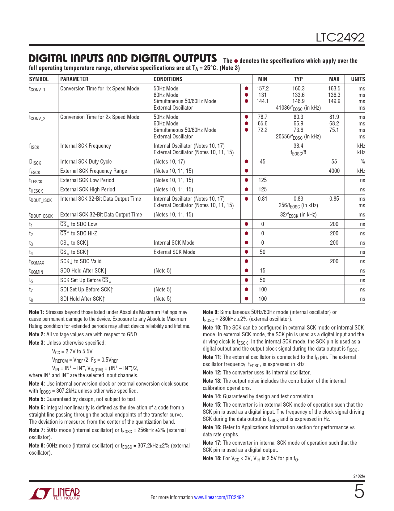 LTC2492 DigiTal inpuTs anD DigiTal ouTpuTs The l denotes the specifications which apply over thefull operating temperature range, otherwise specifications are at TA = 25°C. (Note 3)SYMBOLPARAMETERCONDITIONSMINTYPMAXUNITS tCONV_1 Conversion Time for 1x Speed Mode 50Hz Mode l 157.2 160.3 163.5 ms 60Hz Mode l 131 133.6 136.3 ms Simultaneous 50/60Hz Mode l 144.1 146.9 149.9 ms External Oscillator 41036/fEOSC (in kHz) ms tCONV_2 Conversion Time for 2x Speed Mode 50Hz Mode l 78.7 80.3 81.9 ms 60Hz Mode l 65.6 66.9 68.2 ms Simultaneous 50/60Hz Mode l 72.2 73.6 75.1 ms External Oscillator 20556/fEOSC (in kHz) ms fISCK Internal SCK Frequency Internal Oscillator (Notes 10, 17) 38.4 kHz External Oscillator (Notes 10, 11, 15) fEOSC/8 kHz DISCK Internal SCK Duty Cycle (Notes 10, 17) l 45 55 % fESCK External SCK Frequency Range (Notes 10, 11, 15) l 4000 kHz tLESCK External SCK Low Period (Notes 10, 11, 15) l 125 ns tHESCK External SCK High Period (Notes 10, 11, 15) l 125 ns tDOUT_ISCK Internal SCK 32-Bit Data Output Time Internal Oscillator (Notes 10, 17) l 0.81 0.83 0.85 ms External Oscillator (Notes 10, 11, 15) 256/fEOSC (in kHz) ms tDOUT_ESCK External SCK 32-Bit Data Output Time (Notes 10, 11, 15) 32/fESCK (in kHz) ms t1 CS↓ to SDO Low l 0 200 ns t2 CS↑ to SDO Hi-Z l 0 200 ns t3 CS↓ to SCK↓ Internal SCK Mode l 0 200 ns t4 CS↓ to SCK↑ External SCK Mode l 50 ns tKQMAX SCK↓ to SDO Valid l 200 ns tKQMIN SDO Hold After SCK↓ (Note 5) l 15 ns t5 SCK Set Up Before CS↓ l 50 ns t7 SDI Set Up Before SCK↑ (Note 5) l 100 ns t8 SDI Hold After SCK↑ (Note 5) l 100 ns Note 1: Stresses beyond those listed under Absolute Maximum Ratings may Note 9: Simultaneous 50Hz/60Hz mode (internal oscillator) or cause permanent damage to the device. Exposure to any Absolute Maximum fEOSC = 280kHz ±2% (external oscillator). Rating condition for extended periods may affect device reliability and lifetime. Note 10: The SCK can be configured in external SCK mode or internal SCK Note 2: All voltage values are with respect to GND. mode. In external SCK mode, the SCK pin is used as a digital input and the Note 3: Unless otherwise specified: driving clock is fESCK. In the internal SCK mode, the SCK pin is used as a V digital output and the output clock signal during the data output is f CC = 2.7V to 5.5V ISCK. V Note 11: The external oscillator is connected to the f REFCM = VREF/2, FS = 0.5VREF O pin. The external oscillator frequency, f V EOSC, is expressed in kHz. IN = IN+ – IN–, VIN(CM) = (IN+ – IN–)/2, where IN+ and IN– are the selected input channels. Note 12: The converter uses its internal oscillator. Note 4: Use internal conversion clock or external conversion clock source Note 13: The output noise includes the contribution of the internal with f calibration operations. EOSC = 307.2kHz unless other wise specified. Note 5: Guaranteed by design, not subject to test. Note 14: Guaranteed by design and test correlation. Note 6: Integral nonlinearity is defined as the deviation of a code from a Note 15: The converter is in external SCK mode of operation such that the straight line passing through the actual endpoints of the transfer curve. SCK pin is used as a digital input. The frequency of the clock signal driving The deviation is measured from the center of the quantization band. SCK during the data output is fESCK and is expressed in Hz. Note 7: 50Hz mode (internal oscillator) or f Note 16: Refer to Applications Information section for performance vs EOSC = 256kHz ±2% (external oscillator). data rate graphs. Note 8: 60Hz mode (internal oscillator) or f Note 17: The converter in internal SCK mode of operation such that the EOSC = 307.2kHz ±2% (external oscillator). SCK pin is used as a digital output. Note 18: For VCC < 3V, VIH is 2.5V for pin fO. 2492fe For more information www.linear.com/LTC2492 5 Document Outline Features Applications Typical Application Description Absolute Maximum Ratings Order Information Electrical Characteristics (Normal Speed) Pin Configuration Electrical Characteristics (2x Speed) Converter Characteristics Analog Input and Reference Digital Inputs and Digital Outputs Power Requirements Digital Inputs and Digital Outputs Typical Performance Characteristics Pin Functions Functional Block Diagram Test Circuits Timing Diagrams Applications Information Package Description Revision History Typical Application Related Parts