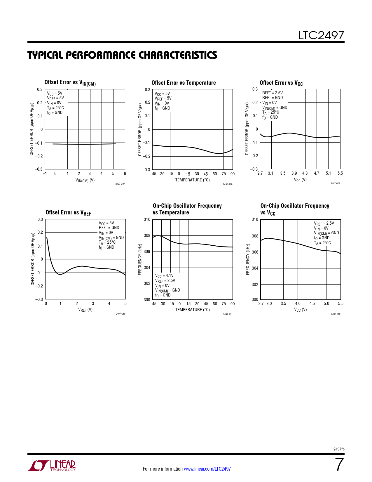 0.3 0.3 0.3 VCC = 5V VCC = 5V REF+ = 2.5V VREF = 5V VREF = 5V REF– = GND ) 0.2 VIN = 0V ) 0.2 VIN = 0V ) 0.2 VIN = 0V REF TA = 25°C REF fO = GND REF VIN(CM) = GND f T 0.1 O = GND 0.1 0.1 A = 25°C fO = GND 0 0 0 –0.1 –0.1 –0.1 OFFSET ERROR (ppm OF V –0.2 OFFSET ERROR (ppm OF V –0.2 OFFSET ERROR (ppm OF V –0.2 –0.3 –0.3 –0.3 –1 0 1 2 3 4 5 6 –45 –30 –15 0 15 30 45 60 75 90 2.7 3.1 3.5 3.9 4.3 4.7 5.1 5.5 VIN(CM) (V) TEMPERATURE (°C) VCC (V) 2497 G07 2497 G08 2497 G09
