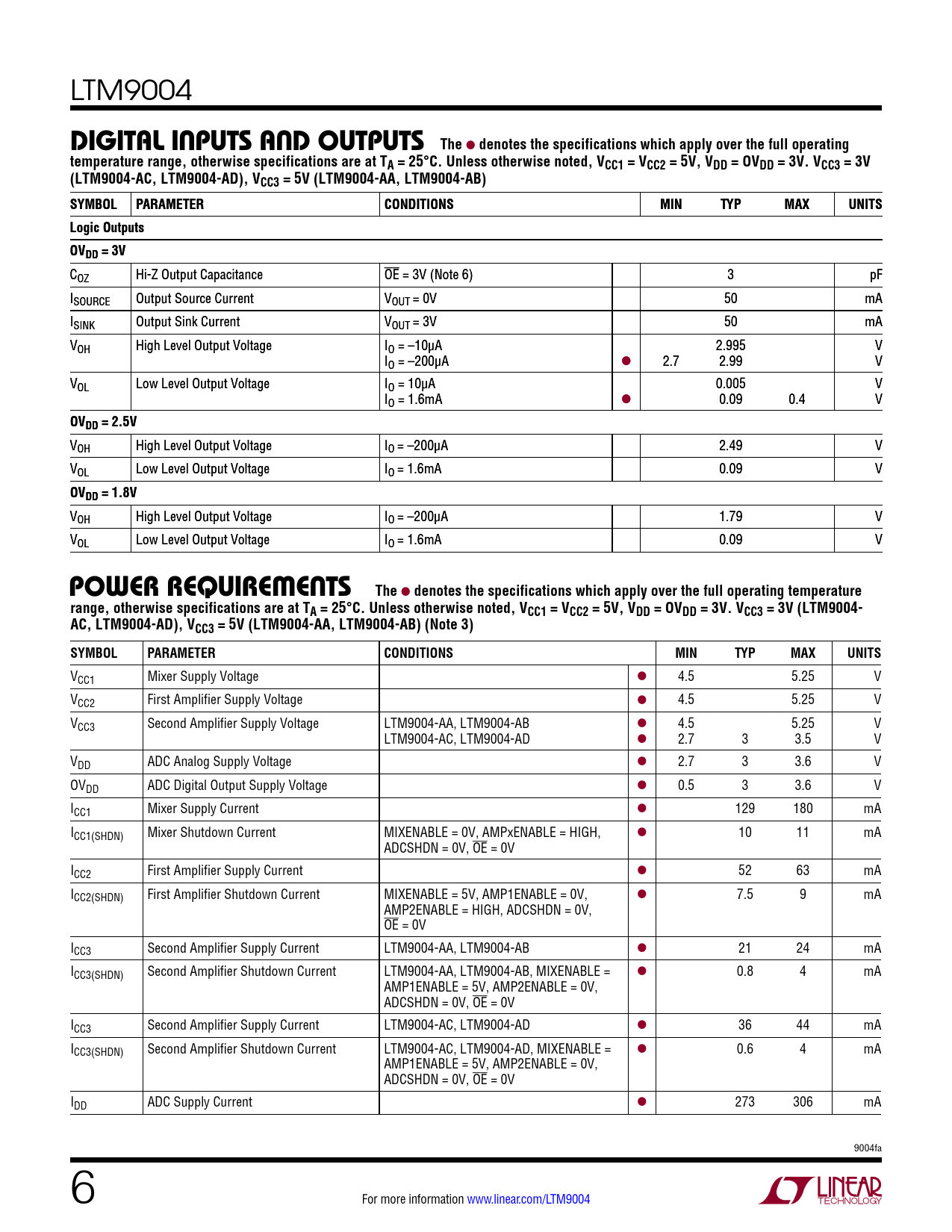 denotes the specifications which apply over the full operating temperature range, otherwise specifications are at TA = 25°C. Unless otherwise noted, VCC1 = VCC2 = 5V, VDD = OVDD = 3V. VCC3 = 3V (LTM9004-AC, LTM9004-AD), VCC3 = 5V (LTM9004-AA, LTM9004-AB) SYMBOL PARAMETER P CONDITIONS MIN TYP TY MAX UNITS Logic Outputs OVDD OV = 3V DD