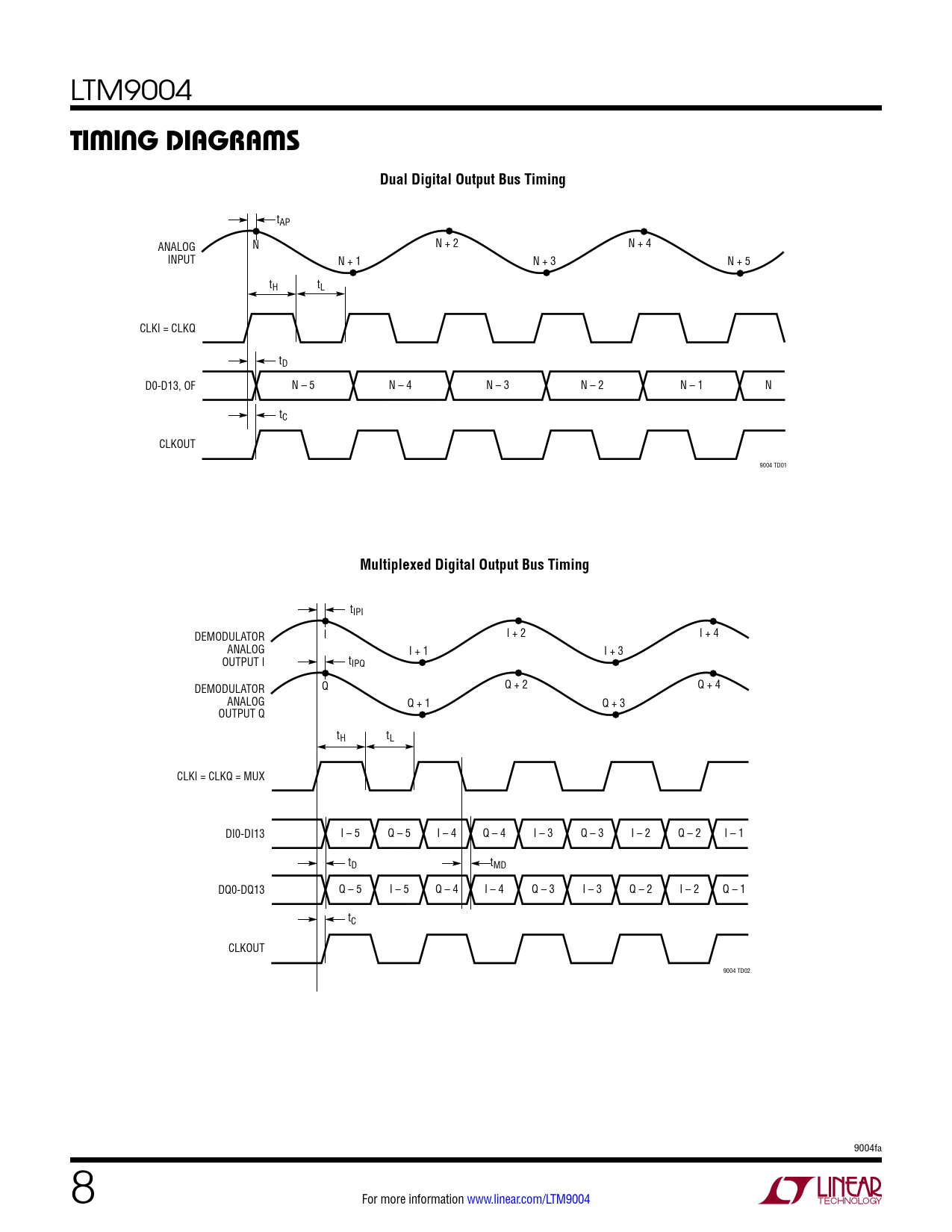 tAP ANALOG N N + 2 N + 4 INPUT N + 1 N + 3 N + 5 tH tL CLKI = CLKQ tD D0-D13, OF N – 5 N – 4 N – 3 N – 2 N – 1 N tC CLKOUT 9004 TD01