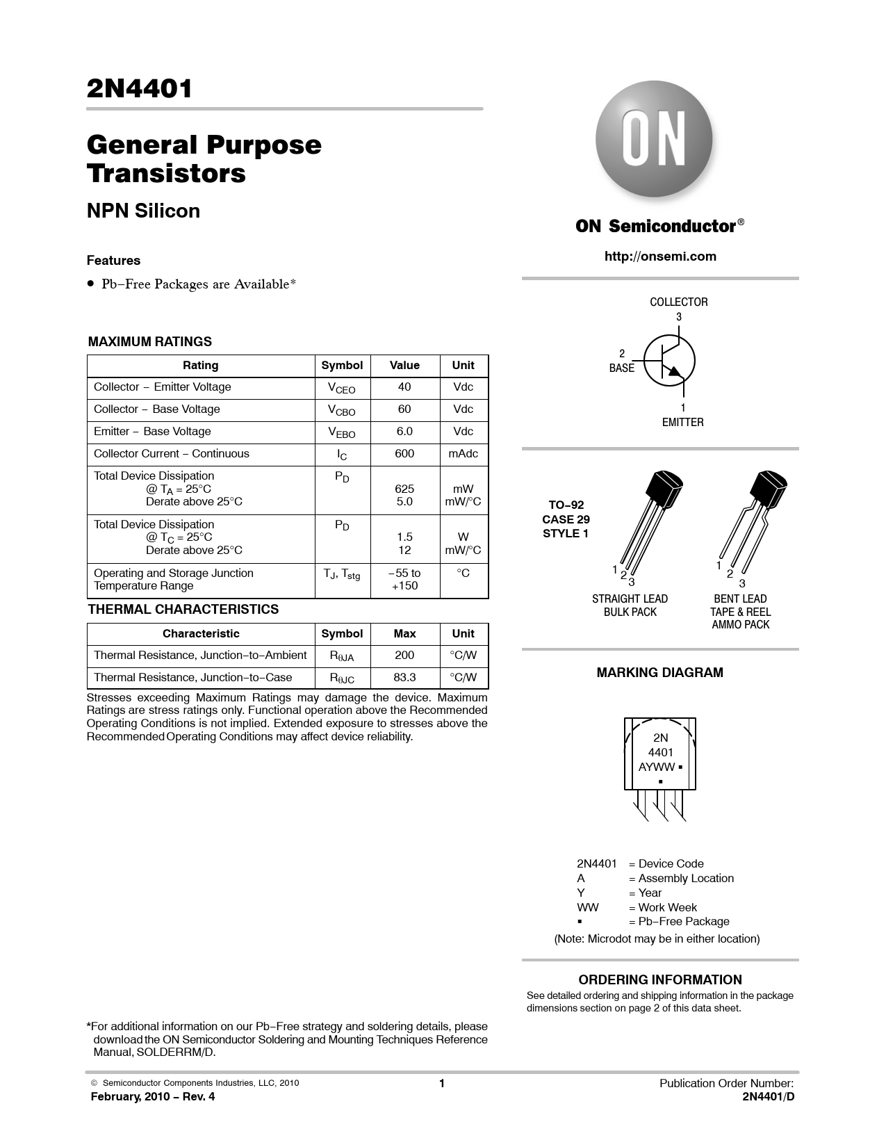 qJC 83.3 °C/W Stresses exceeding Maximum Ratings may damage the device. Maximum Ratings are stress ratings only. Functional operation above the Recommended Operating Conditions is not implied. Extended exposure to stresses above the Recommended Operating Conditions may affect device reliability. 2N 4401 AYWW G G 2N4401 = Device Code A = Assembly Location Y = Year WW = Work Week G = Pb−Free Package (Note: Microdot may be in either location)