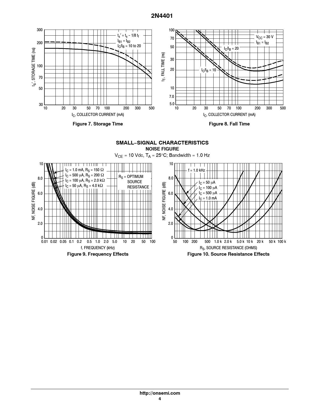 2N4401. Figure 7. Storage Time. Figure 8. Fall Time. SMALL−SIGNAL CHARACTERISTICS. NOISE FIGURE. Figure 9. Frequency Effects