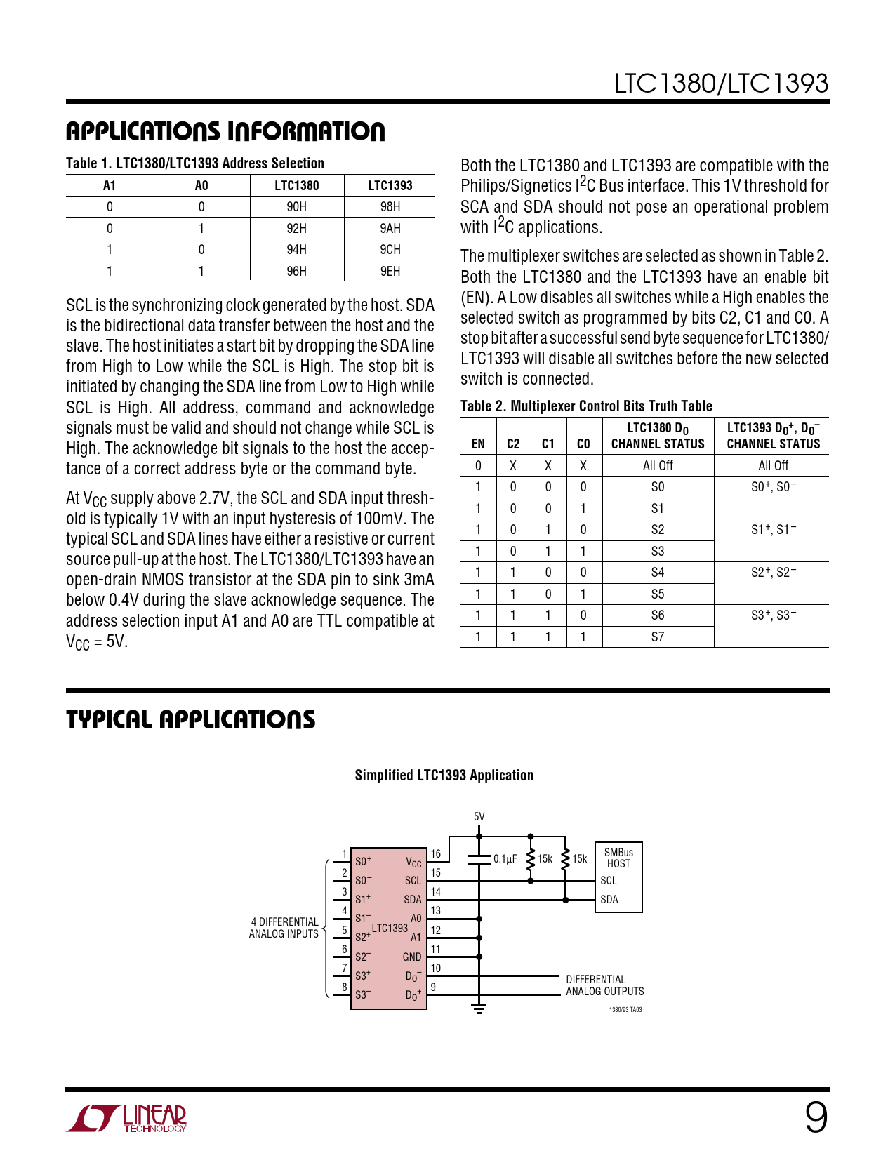 LTC1380/LTC1393 UUWUAPPLICATIONS INFORMATIONTable 1. LTC1380/LTC1393 Address Selection Both the LTC1380 and LTC1393 are compatible with the A1A0LTC1380LTC1393 Philips/Signetics I2C Bus interface. This 1V threshold for 0 0 90H 98H SCA and SDA should not pose an operational problem 0 1 92H 9AH with I2C applications. 1 0 94H 9CH The multiplexer switches are selected as shown in Table 2. 1 1 96H 9EH Both the LTC1380 and the LTC1393 have an enable bit SCL is the synchronizing clock generated by the host. SDA (EN). A Low disables all switches while a High enables the is the bidirectional data transfer between the host and the selected switch as programmed by bits C2, C1 and C0. A slave. The host initiates a start bit by dropping the SDA line stop bit after a successful send byte sequence for LTC1380/ from High to Low while the SCL is High. The stop bit is LTC1393 will disable all switches before the new selected initiated by changing the SDA line from Low to High while switch is connected. SCL is High. All address, command and acknowledge Table 2. Multiplexer Control Bits Truth Table signals must be valid and should not change while SCL is LTC1380 D+–OLTC1393 DO , DO High. The acknowledge bit signals to the host the accep- ENC2C1C0CHANNEL STATUSCHANNEL STATUS tance of a correct address byte or the command byte. 0 X X X All Off All Off 1 0 0 0 S0 S0+, S0– At VCC supply above 2.7V, the SCL and SDA input thresh- 1 0 0 1 S1 old is typically 1V with an input hysteresis of 100mV. The 1 0 1 0 S2 S1+, S1– typical SCL and SDA lines have either a resistive or current 1 0 1 1 S3 source pull-up at the host. The LTC1380/LTC1393 have an open-drain NMOS transistor at the SDA pin to sink 3mA 1 1 0 0 S4 S2+, S2– below 0.4V during the slave acknowledge sequence. The 1 1 0 1 S5 address selection input A1 and A0 are TTL compatible at 1 1 1 0 S6 S3+, S3– V 1 1 1 1 S7 CC = 5V. UTYPICAL APPLICATIONSSimplified LTC1393 Application 5V 1 16 SMBus 0.1 S0+ V µF 15k 15k CC HOST 2 15 S0 – SCL SCL 3 14 S1+ SDA SDA 4 13 4 DIFFERENTIAL S1– A0 5 LTC1393 12 ANALOG INPUTS S2+ A1 6 11 S2– GND 7 10 S3+ D – O DIFFERENTIAL 8 9 + ANALOG OUTPUTS S3– DO 1380/93 TA03 9