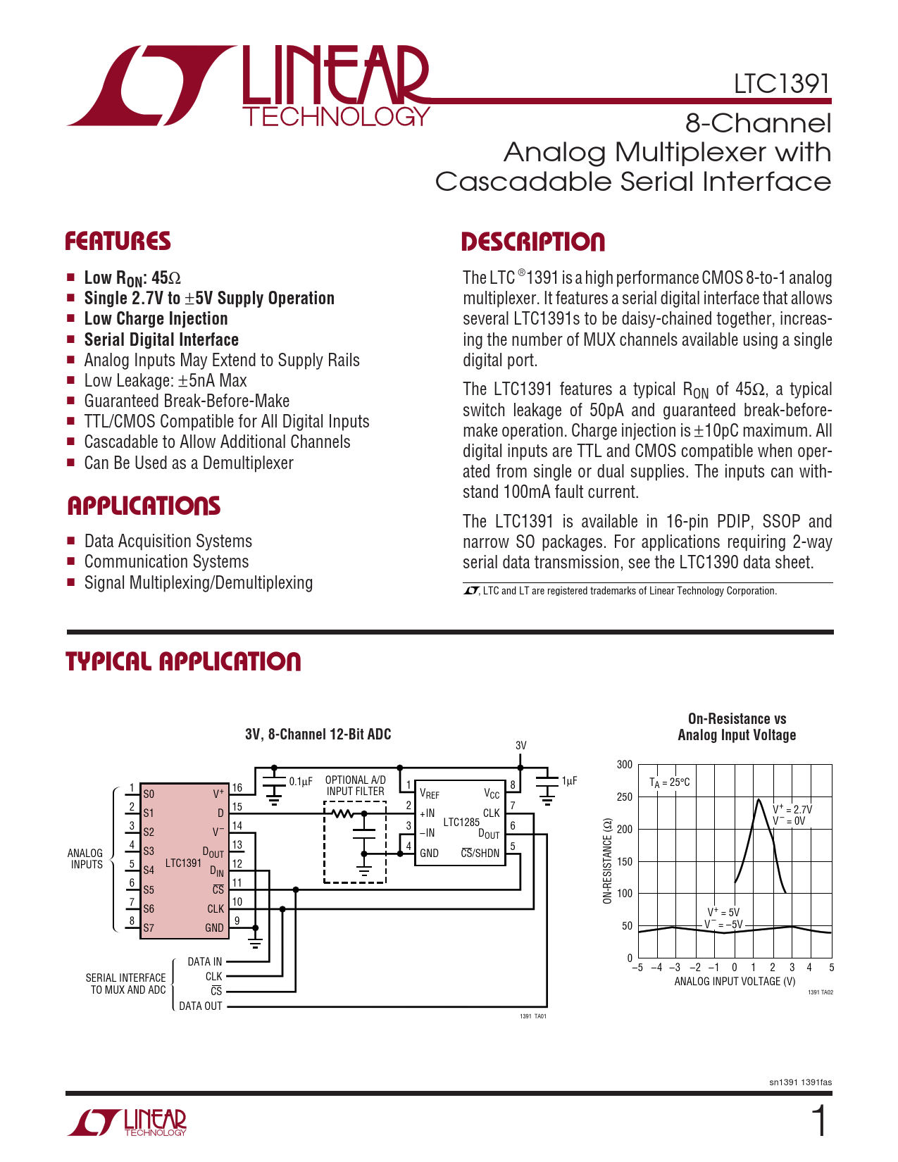 Datasheet LTC1391 Analog Devices, 修订版: LTC1391: 8-Channel Analog Multiplexer with Cascadable Serial Interface Data Sheet