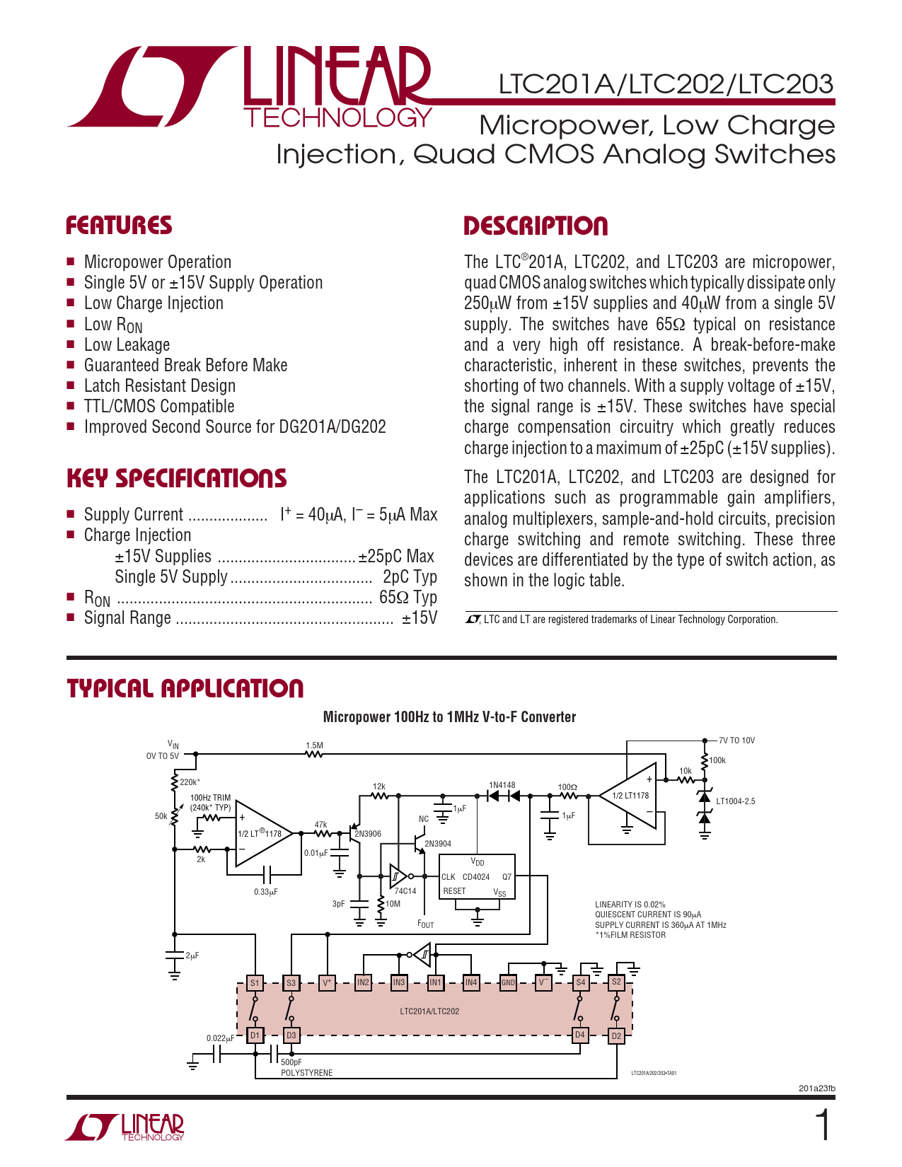 LTC201A/LTC202/LTC203 Micropower, Low Charge Injection, Quad CMOS Analog Switches UFEATURESDESCRIPTIO ■ Micropower Operation The LTC®201A, LTC202, and LTC203 are micropower, ■ Single 5V or ±15V Supply Operation quad CMOS analog switches which typically dissipate only ■ Low Charge Injection 250µW from ±15V supplies and 40µW from a single 5V ■ Low RON supply. The switches have 65Ω typical on resistance ■ Low Leakage and a very high off resistance. A break-before-make ■ Guaranteed Break Before Make characteristic, inherent in these switches, prevents the ■ Latch Resistant Design shorting of two channels. With a supply voltage of ±15V, ■ TTL/CMOS Compatible the signal range is ±15V. These switches have special ■ Improved Second Source for DG2O1A/DG202 charge compensation circuitry which greatly reduces charge injection to a maximum of ±25pC (±15V supplies). U The LTC201A, LTC202, and LTC203 are designed for KEY SPECIFICATIO S applications such as programmable gain amplifiers, ■ Supply Current ... I+ = 40µA, I– = 5µA Max analog multiplexers, sample-and-hold circuits, precision ■ Charge Injection charge switching and remote switching. These three ±15V Supplies ... ±25pC Max devices are differentiated by the type of switch action, as Single 5V Supply .. 2pC Typ shown in the logic table. ■ RON ... 65Ω Typ ■ Signal Range .. ±15V , LTC and LT are registered trademarks of Linear Technology Corporation. UTYPICAL APPLICATIOMicropower 100Hz to 1MHz V-to-F Converter V 7V TO 10V IN 1.5M OV TO 5V 100k 10k + 220k* 12k 1N4148 100Ω 100Hz TRIM 1/2 LT1178 LT1004-2.5 (240k* TYP) 1µF – 50k 1 + µF NC 47k 1/2 LT ®1178 2N3906 2N3904 – 0.01µF 2k VDD CLK CD4024 Q7 0.33µF 74C14 RESET VSS 3pF 10M LINEARITY IS 0.02% QUIESCENT CURRENT IS 90µA FOUT SUPPLY CURRENT IS 360µA AT 1MHz *1%FILM RESISTOR 2µF S1 S3 V+ IN2 IN3 IN1 IN4 GND V– S4 S2 LTC201A/LTC202 D1 D3 0.022µF D4 D2 500pF POLYSTYRENE LTC201A/202/203•TA01 201a23fb 1