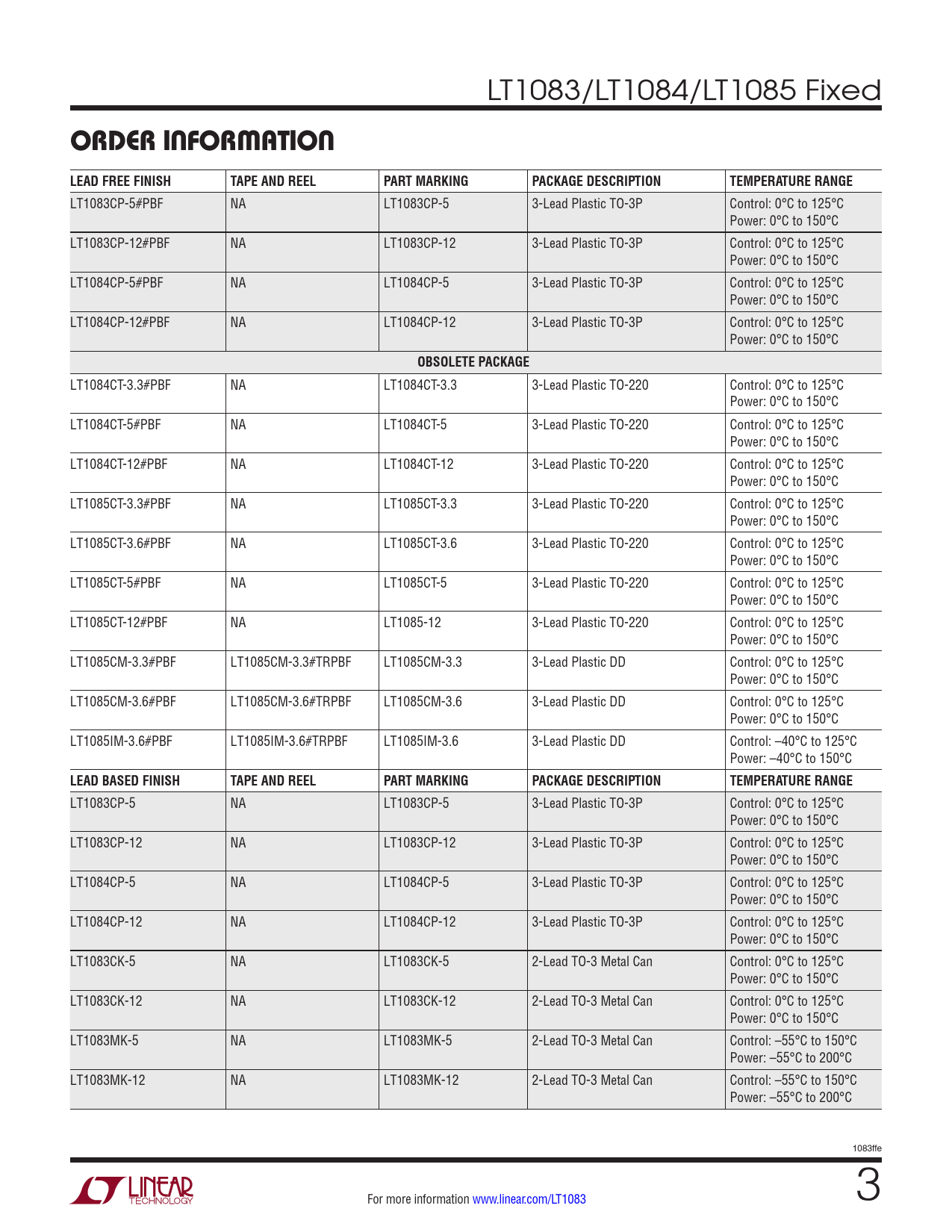 LT1084CT-3.3#PBF NA LT1084CT-3.3 3-Lead Plastic TO-220 Control: 0°C to 125°C Power: 0°C to 150°C LT1084CT-5#PBF NA LT1084CT-5 3-Lead Plastic TO-220 Control: 0°C to 125°C Power: 0°C to 150°C LT1084CT-12#PBF NA LT1084CT-12 3-Lead Plastic TO-220 Control: 0°C to 125°C Power: 0°C to 150°C LT1085CT-3.3#PBF NA LT1085CT-3.3 3-Lead Plastic TO-220 Control: 0°C to 125°C Power: 0°C to 150°C LT1085CT-3.6#PBF NA LT1085CT-3.6 3-Lead Plastic TO-220 Control: 0°C to 125°C Power: 0°C to 150°C LT1085CT-5#PBF NA LT1085CT-5 3-Lead Plastic TO-220 Control: 0°C to 125°C Power: 0°C to 150°C LT1085CT-12#PBF NA LT1085-12 3-Lead Plastic TO-220 Control: 0°C to 125°C Power: 0°C to 150°C LT1085CM-3.3#PBF LT1085CM-3.3#TRPBF LT1085CM-3.3 3-Lead Plastic DD Control: 0°C to 125°C Power: 0°C to 150°C LT1085CM-3.6#PBF LT1085CM-3.6#TRPBF LT1085CM-3.6 3-Lead Plastic DD Control: 0°C to 125°C Power: 0°C to 150°C LT1085IM-3.6#PBF LT1085IM-3.6#TRPBF LT1085IM-3.6 3-Lead Plastic DD Control: –40°C to 125°C Power: –40°C to 150°C