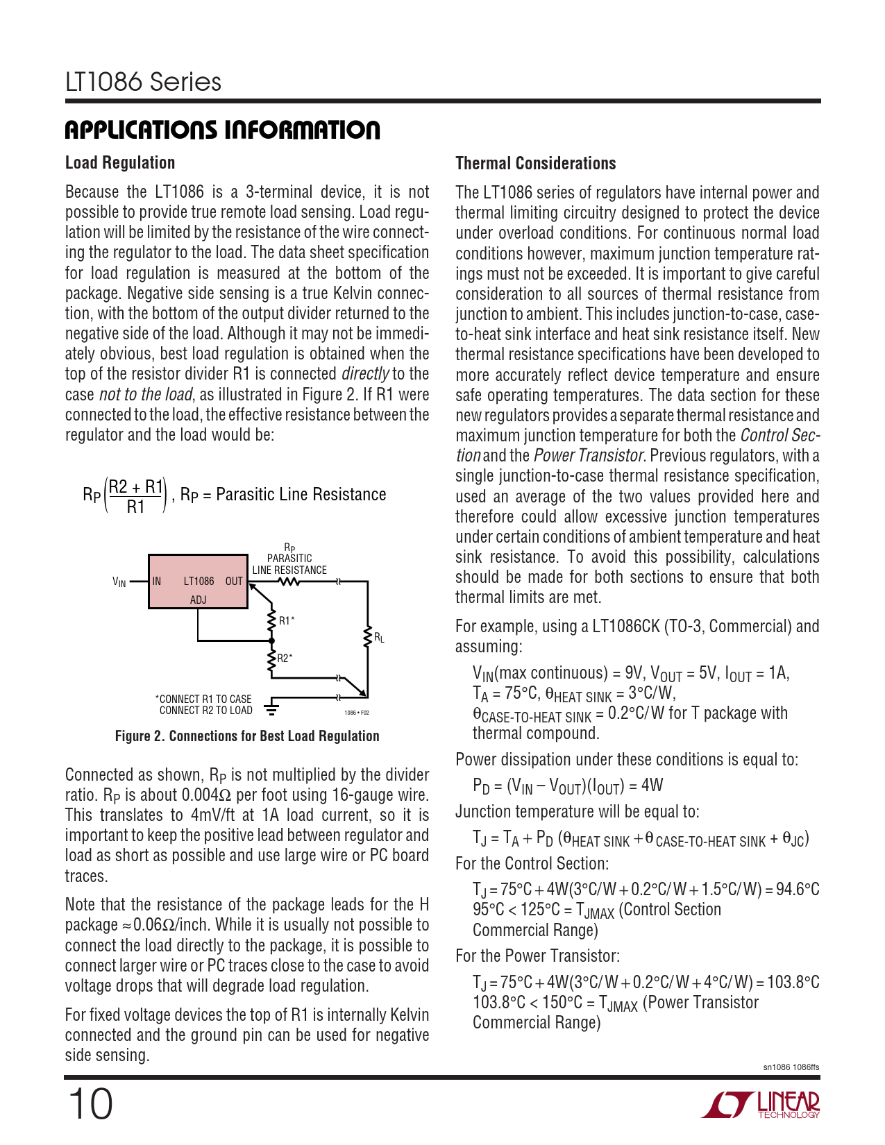 thermal compound. Power dissipation under these conditions is equal to: Connected as shown, RP is not multiplied by the divider PD = (VIN – VOUT)(IOUT) = 4W ratio. RP is about 0.004Ω per foot using 16-gauge wire. Junction temperature will be equal to: This translates to 4mV/ft at 1A load current, so it is important to keep the positive lead between regulator and TJ = TA + PD (θHEAT SINK + θ CASE-TO-HEAT SINK + θJC) load as short as possible and use large wire or PC board For the Control Section: traces. TJ = 75°C + 4W(3°C/W + 0.2°C/ W + 1.5°C/W) = 94.6°C Note that the resistance of the package leads for the H 95°C < 125°C = TJMAX (Control Section package ≈ 0.06Ω/inch. While it is usually not possible to Commercial Range) connect the load directly to the package, it is possible to For the Power Transistor: connect larger wire or PC traces close to the case to avoid T voltage drops that will degrade load regulation. J = 75°C + 4W(3°C/ W + 0.2°C/ W + 4°C/ W) = 103.8°C 103.8°C < 150°C = TJMAX (Power Transistor For fixed voltage devices the top of R1 is internally Kelvin Commercial Range) connected and the ground pin can be used for negative side sensing. sn1086 1086ffs 10