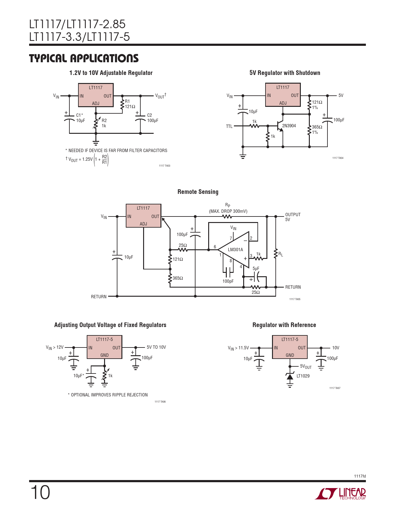 TYPICAL APPLICATIONS. 1.2V to 10V Adjustable Regulator. 5V Regulator with Shutdown. Remote Sensing