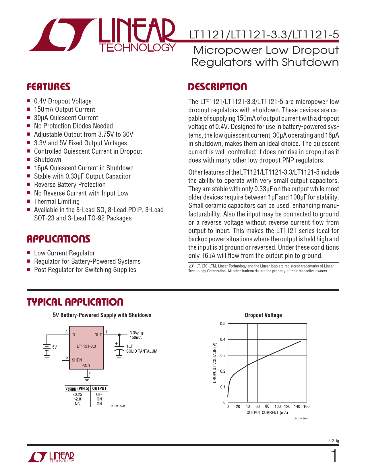 LT1121/LT1121-3.3/LT1121-5 Micropower Low Dropout Regulators with Shutdown