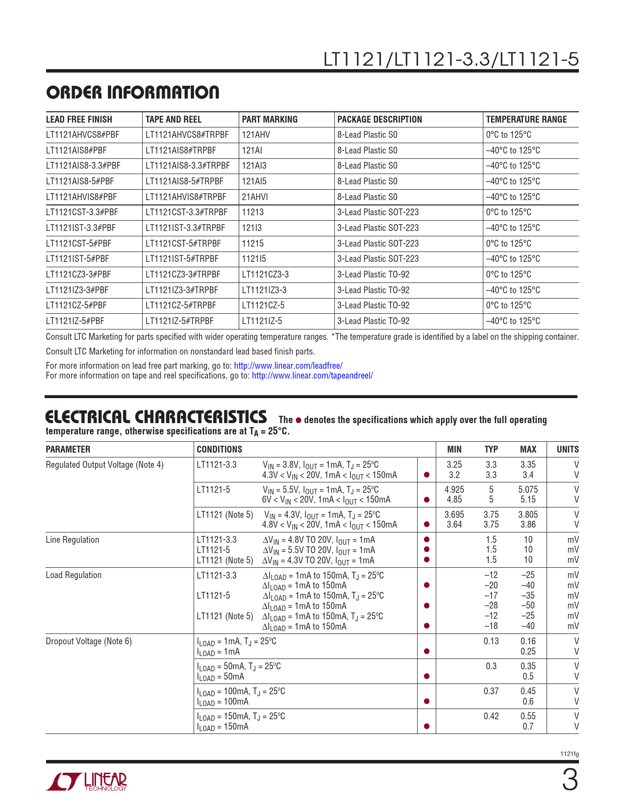LT1121AHVCS8#PBF LT1121AHVCS8#TRPBF 121AHV 8-Lead Plastic S0 0°C to 125°C LT1121AIS8#PBF LT1121AIS8#TRPBF 121AI 8-Lead Plastic S0 –40°C to 125°C LT1121AIS8-3.3#PBF LT1121AIS8-3.3#TRPBF 121AI3 8-Lead Plastic S0 –40°C to 125°C LT1121AIS8-5#PBF LT1121AIS8-5#TRPBF 121AI5 8-Lead Plastic S0 –40°C to 125°C LT1121AHVIS8#PBF LT1121AHVIS8#TRPBF 21AHVI 8-Lead Plastic S0 –40°C to 125°C LT1121CST-3.3#PBF LT1121CST-3.3#TRPBF 11213 3-Lead Plastic SOT-223 0°C to 125°C LT1121IST-3.3#PBF LT1121IST-3.3#TRPBF 121I3 3-Lead Plastic SOT-223 –40°C to 125°C LT1121CST-5#PBF LT1121CST-5#TRPBF 11215 3-Lead Plastic SOT-223 0°C to 125°C LT1121IST-5#PBF LT1121IST-5#TRPBF 1121I5 3-Lead Plastic SOT-223 –40°C to 125°C LT1121CZ3-3#PBF LT1121CZ3-3#TRPBF LT1121CZ3-3 3-Lead Plastic TO-92 0°C to 125°C LT1121IZ3-3#PBF LT1121IZ3-3#TRPBF LT1121IZ3-3 3-Lead Plastic TO-92 –40°C to 125°C LT1121CZ-5#PBF LT1121CZ-5#TRPBF LT1121CZ-5 3-Lead Plastic TO-92 0°C to 125°C LT1121IZ-5#PBF LT1121IZ-5#TRPBF LT1121IZ-5 3-Lead Plastic TO-92 –40°C to 125°C Consult LTC Marketing for parts specified with wider operating temperature ranges. *The temperature grade is identified by a label on the shipping container. Consult LTC Marketing for information on nonstandard lead based finish parts. For more information on lead free part marking, go to: http://www.linear.com/leadfree/ For more information on tape and reel specifications, go to: http://www.linear.com/tapeandreel/