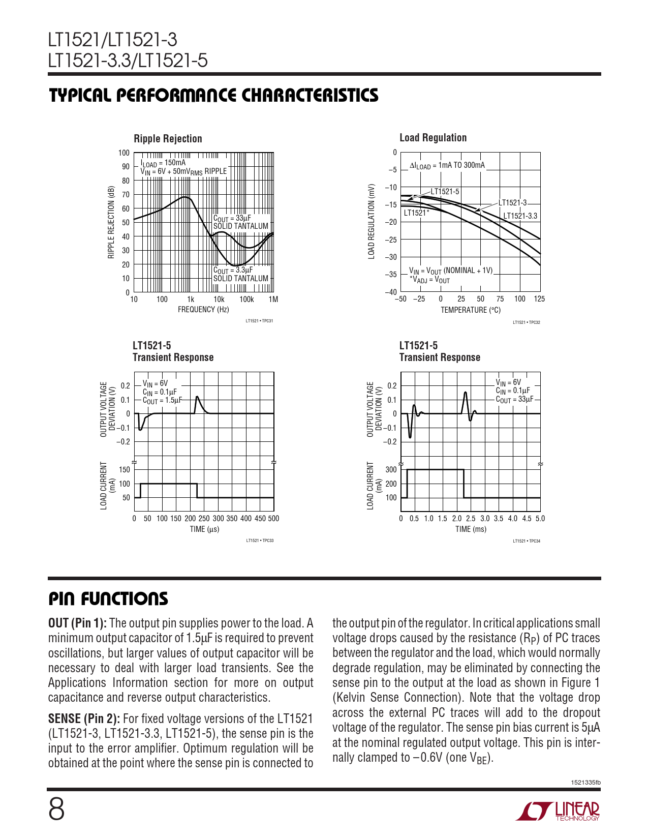 TYPICAL PERFORMANCE CHARACTERISTICS. Ripple Rejection. Load Regulation. LT1521-5. Transient Response. PIN FUNCTIONS. OUT (Pin 1):