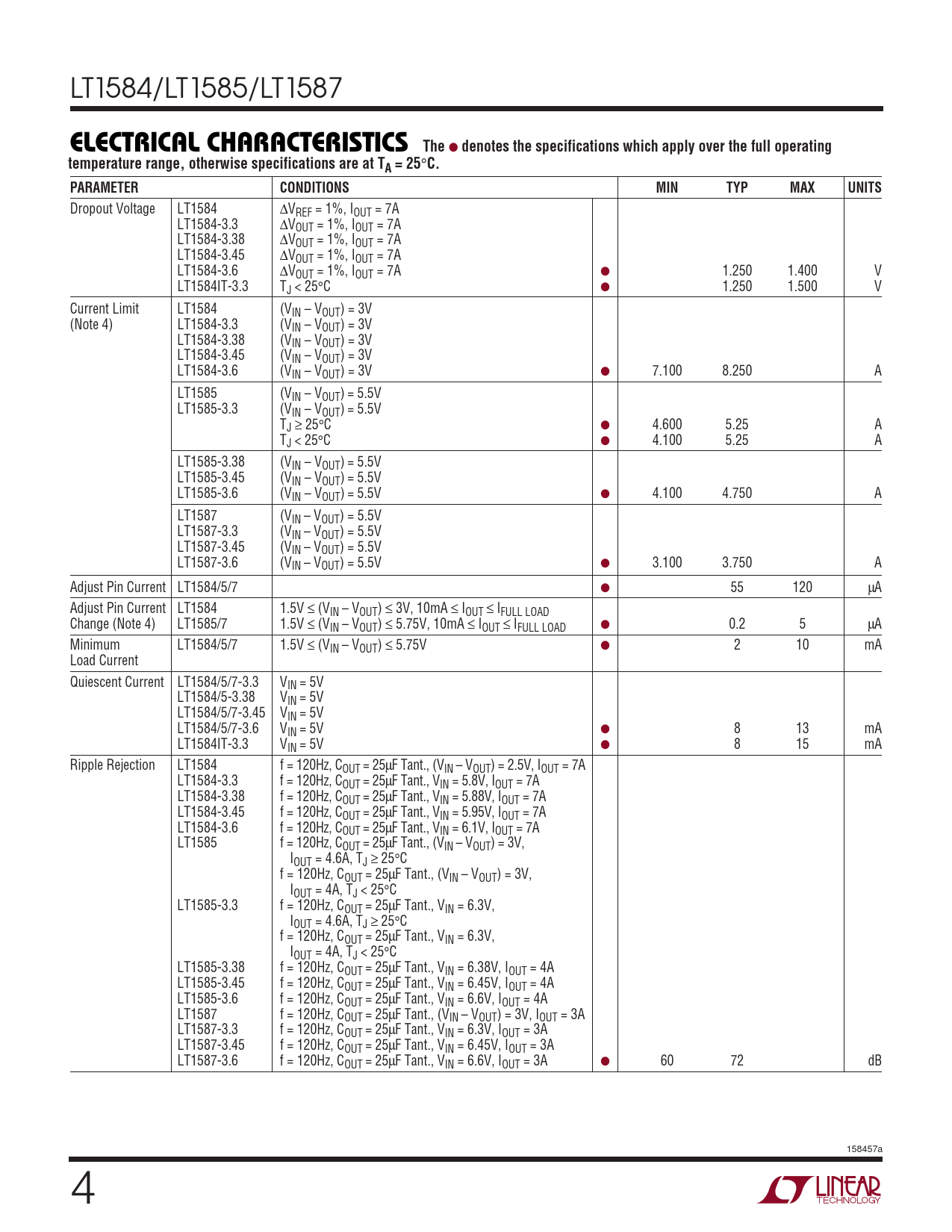 Dropout Voltage LT1584 ∆VREF = 1%, IOUT = 7A LT1584-3.3 ∆VOUT = 1%, IOUT = 7A LT1584-3.38 ∆VOUT = 1%, IOUT = 7A LT1584-3.45 ∆VOUT = 1%, IOUT = 7A LT1584-3.6 ∆VOUT = 1%, IOUT = 7A ● 1.250 1.400 V LT1584IT-3.3 TJ < 25°C ● 1.250 1.500 V Current Limit LT1584 (VIN – VOUT) = 3V (Note 4) LT1584-3.3 (VIN – VOUT) = 3V LT1584-3.38 (VIN – VOUT) = 3V LT1584-3.45 (VIN – VOUT) = 3V LT1584-3.6 (VIN – VOUT) = 3V ● 7.100 8.250 A LT1585 (VIN – VOUT) = 5.5V LT1585-3.3 (VIN – VOUT) = 5.5V TJ ≥ 25°C ● 4.600 5.25 A TJ < 25°C ● 4.100 5.25 A LT1585-3.38 (VIN – VOUT) = 5.5V LT1585-3.45 (VIN – VOUT) = 5.5V LT1585-3.6 (VIN – VOUT) = 5.5V ● 4.100 4.750 A LT1587 (VIN – VOUT) = 5.5V LT1587-3.3 (VIN – VOUT) = 5.5V LT1587-3.45 (VIN – VOUT) = 5.5V LT1587-3.6 (VIN – VOUT) = 5.5V ● 3.100 3.750 A Adjust Pin Current LT1584/5/7 ● 55 120 µA Adjust Pin Current LT1584 1.5V ≤ (VIN – VOUT) ≤ 3V, 10mA ≤ IOUT ≤ IFULL LOAD Change (Note 4) LT1585/7 1.5V ≤ (VIN – VOUT) ≤ 5.75V, 10mA ≤ IOUT ≤ IFULL LOAD ● 0.2 5 µA Minimum LT1584/5/7 1.5V ≤ (VIN – VOUT) ≤ 5.75V ● 2 10 mA Load Current Quiescent Current LT1584/5/7-3.3 VIN = 5V LT1584/5-3.38 VIN = 5V LT1584/5/7-3.45 VIN = 5V LT1584/5/7-3.6 VIN = 5V ● 8 13 mA LT1584IT-3.3 VIN = 5V ● 8 15 mA Ripple Rejection LT1584 f = 120Hz, COUT = 25µF Tant., (VIN – VOUT) = 2.5V, IOUT = 7A LT1584-3.3 f = 120Hz, COUT = 25µF Tant., VIN = 5.8V, IOUT = 7A LT1584-3.38 f = 120Hz, COUT = 25µF Tant., VIN = 5.88V, IOUT = 7A LT1584-3.45 f = 120Hz, COUT = 25µF Tant., VIN = 5.95V, IOUT = 7A LT1584-3.6 f = 120Hz, COUT = 25µF Tant., VIN = 6.1V, IOUT = 7A LT1585 f = 120Hz, COUT = 25µF Tant., (VIN – VOUT) = 3V, IOUT = 4.6A, TJ ≥ 25°C f = 120Hz, COUT = 25µF Tant., (VIN – VOUT) = 3V, IOUT = 4A, TJ < 25°C LT1585-3.3 f = 120Hz, COUT = 25µF Tant., VIN = 6.3V, IOUT = 4.6A, TJ ≥ 25°C f = 120Hz, COUT = 25µF Tant., VIN = 6.3V, IOUT = 4A, TJ < 25°C LT1585-3.38 f = 120Hz, COUT = 25µF Tant., VIN = 6.38V, IOUT = 4A LT1585-3.45 f = 120Hz, COUT = 25µF Tant., VIN = 6.45V, IOUT = 4A LT1585-3.6 f = 120Hz, COUT = 25µF Tant., VIN = 6.6V, IOUT = 4A LT1587 f = 120Hz, COUT = 25µF Tant., (VIN – VOUT) = 3V, IOUT = 3A LT1587-3.3 f = 120Hz, COUT = 25µF Tant., VIN = 6.3V, IOUT = 3A LT1587-3.45 f = 120Hz, COUT = 25µF Tant., VIN = 6.45V, IOUT = 3A LT1587-3.6 f = 120Hz, COUT = 25µF Tant., VIN = 6.6V, IOUT = 3A ● 60 72 dB 158457a 4
