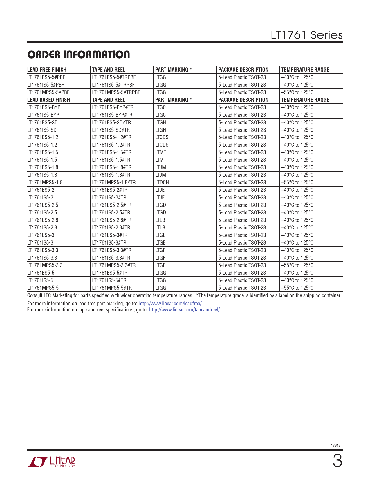 LT1761ES5-5#PBF LT1761ES5-5#TRPBF LTGG 5-Lead Plastic TSOT-23 –40°C to 125°C LT1761IS5-5#PBF LT1761IS5-5#TRPBF LTGG 5-Lead Plastic TSOT-23 –40°C to 125°C LT1761MPS5-5#PBF LT1761MPS5-5#TRPBF LTGG 5-Lead Plastic TSOT-23 –55°C to 125°C