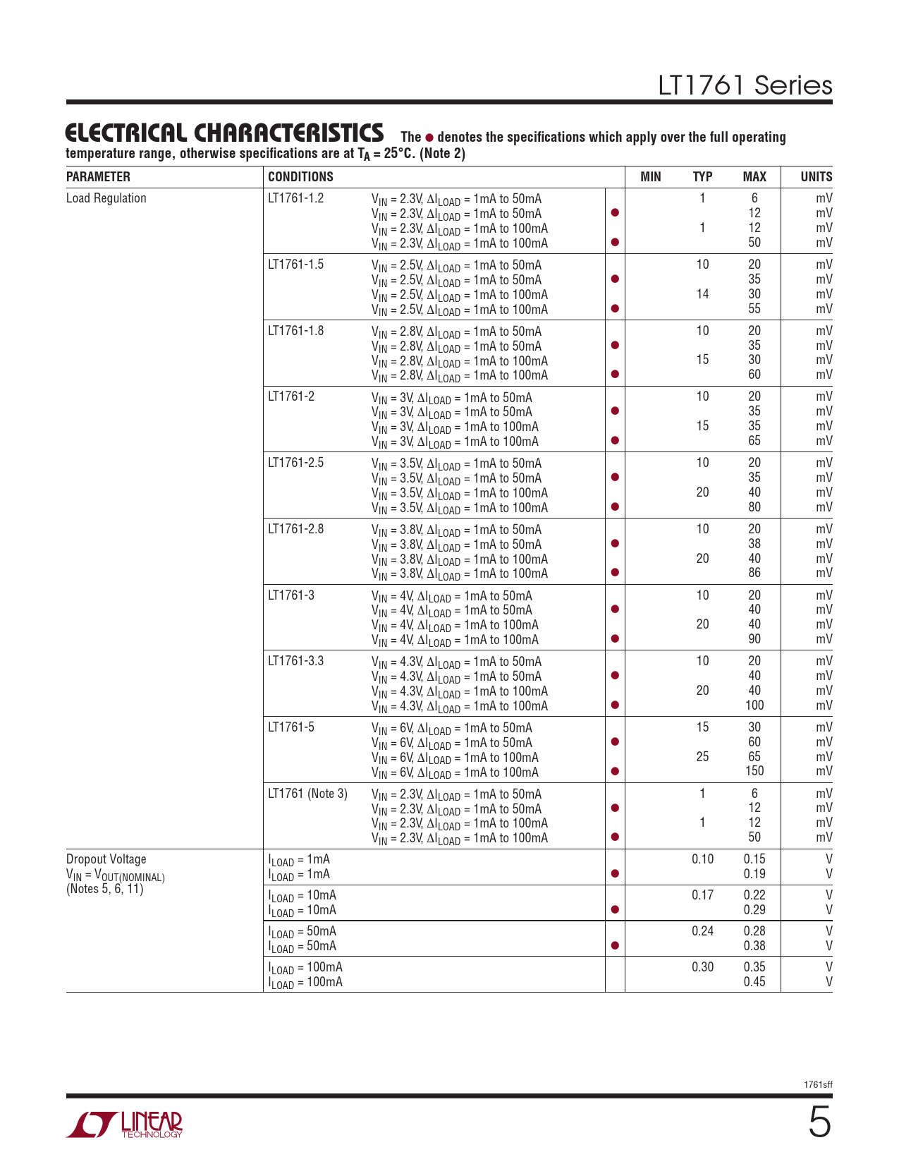 Load Regulation LT1761-1.2 VIN = 2.3V, ΔILOAD = 1mA to 50mA 1 6 mV l VIN = 2.3V, ΔILOAD = 1mA to 50mA 12 mV VIN = 2.3V, ΔILOAD = 1mA to 100mA 1 12 mV V l IN = 2.3V, ΔILOAD = 1mA to 100mA 50 mV LT1761-1.5 VIN = 2.5V, ΔILOAD = 1mA to 50mA 10 20 mV V l IN = 2.5V, ΔILOAD = 1mA to 50mA 35 mV VIN = 2.5V, ΔILOAD = 1mA to 100mA 14 30 mV V l IN = 2.5V, ΔILOAD = 1mA to 100mA 55 mV LT1761-1.8 VIN = 2.8V, ΔILOAD = 1mA to 50mA 10 20 mV V l IN = 2.8V, ΔILOAD = 1mA to 50mA 35 mV VIN = 2.8V, ΔILOAD = 1mA to 100mA 15 30 mV V l IN = 2.8V, ΔILOAD = 1mA to 100mA 60 mV LT1761-2 VIN = 3V, ΔILOAD = 1mA to 50mA 10 20 mV V l IN = 3V, ΔILOAD = 1mA to 50mA 35 mV VIN = 3V, ΔILOAD = 1mA to 100mA 15 35 mV V l IN = 3V, ΔILOAD = 1mA to 100mA 65 mV LT1761-2.5 VIN = 3.5V, ΔILOAD = 1mA to 50mA 10 20 mV V l IN = 3.5V, ΔILOAD = 1mA to 50mA 35 mV VIN = 3.5V, ΔILOAD = 1mA to 100mA 20 40 mV V l IN = 3.5V, ΔILOAD = 1mA to 100mA 80 mV LT1761-2.8 VIN = 3.8V, ΔILOAD = 1mA to 50mA 10 20 mV V l IN = 3.8V, ΔILOAD = 1mA to 50mA 38 mV VIN = 3.8V, ΔILOAD = 1mA to 100mA 20 40 mV V l IN = 3.8V, ΔILOAD = 1mA to 100mA 86 mV LT1761-3 VIN = 4V, ΔILOAD = 1mA to 50mA 10 20 mV V l IN = 4V, ΔILOAD = 1mA to 50mA 40 mV VIN = 4V, ΔILOAD = 1mA to 100mA 20 40 mV V l IN = 4V, ΔILOAD = 1mA to 100mA 90 mV LT1761-3.3 VIN = 4.3V, ΔILOAD = 1mA to 50mA 10 20 mV V l IN = 4.3V, ΔILOAD = 1mA to 50mA 40 mV VIN = 4.3V, ΔILOAD = 1mA to 100mA 20 40 mV V l IN = 4.3V, ΔILOAD = 1mA to 100mA 100 mV LT1761-5 VIN = 6V, ΔILOAD = 1mA to 50mA 15 30 mV V l IN = 6V, ΔILOAD = 1mA to 50mA 60 mV VIN = 6V, ΔILOAD = 1mA to 100mA 25 65 mV V l IN = 6V, ΔILOAD = 1mA to 100mA 150 mV LT1761 (Note 3) VIN = 2.3V, ΔILOAD = 1mA to 50mA 1 6 mV V l IN = 2.3V, ΔILOAD = 1mA to 50mA 12 mV VIN = 2.3V, ΔILOAD = 1mA to 100mA 1 12 mV V l IN = 2.3V, ΔILOAD = 1mA to 100mA 50 mV Dropout Voltage ILOAD = 1mA 0.10 0.15 V VIN = VOUT(NOMINAL) ILOAD = 1mA l 0.19 V (Notes 5, 6, 11) ILOAD = 10mA 0.17 0.22 V ILOAD = 10mA l 0.29 V ILOAD = 50mA 0.24 0.28 V ILOAD = 50mA l 0.38 V ILOAD = 100mA 0.30 0.35 V ILOAD = 100mA 0.45 V 1761sff 5 Document Outline FEATURES DESCRIPTION APPLICATIONS TYPICAL APPLICATION ABSOLUTE MAXIMUM RATINGS PIN CONFIGURATION ORDER INFORMATION ELECTRICAL CHARACTERISTICS TYPICAL PERFORMANCE CHARACTERISTICS PIN FUNCTIONS APPLICATIONS INFORMATION PACKAGE DESCRIPTION REVISION HISTORY TYPICAL APPLICATION RELATED PARTS