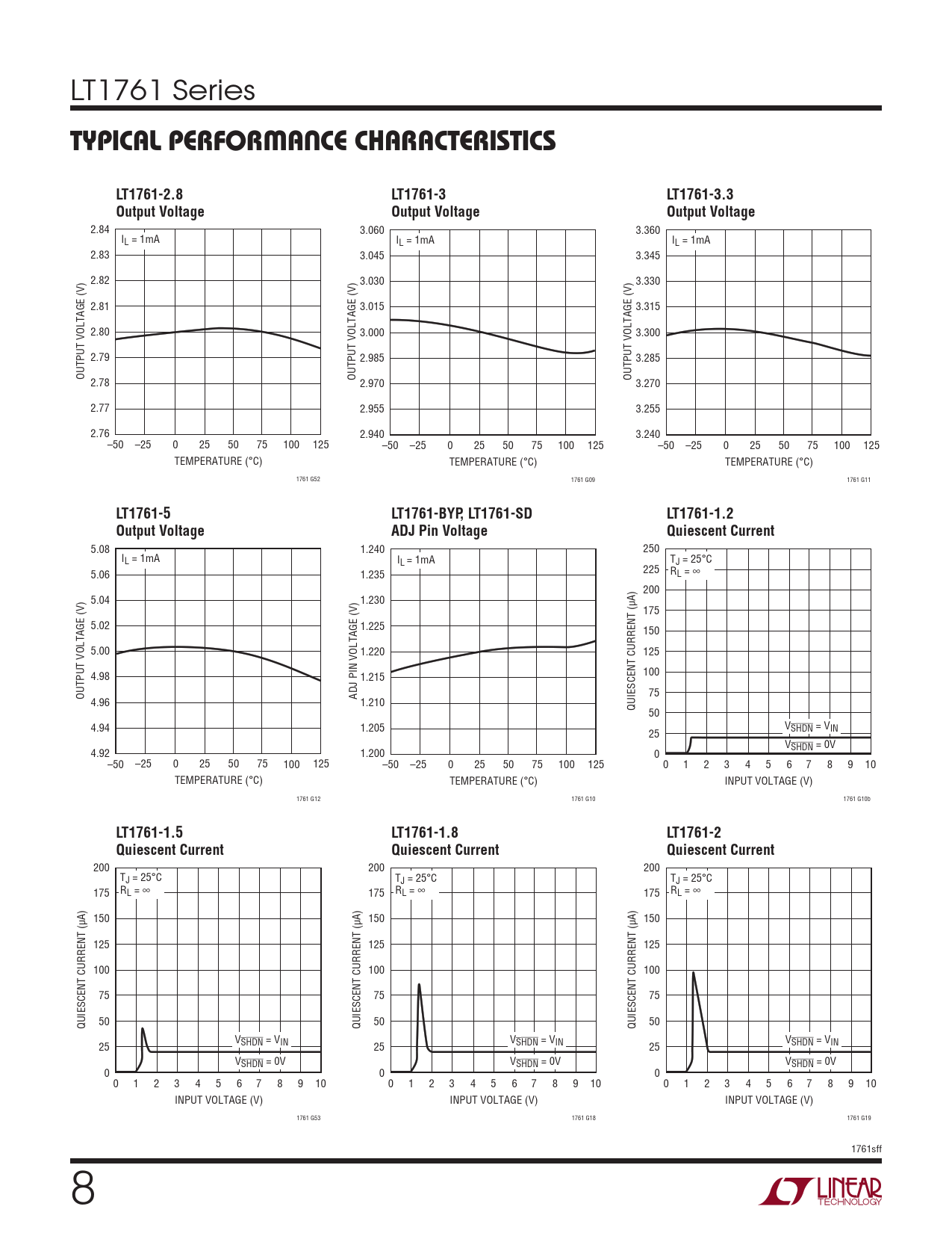 TYPICAL PERFORMANCE CHARACTERISTICS. LT1761-2.8. LT1761-3. LT1761-3.3. Output Voltage. LT1761-5. LT1761-BYP, LT1761-SD. LT1761-1.2