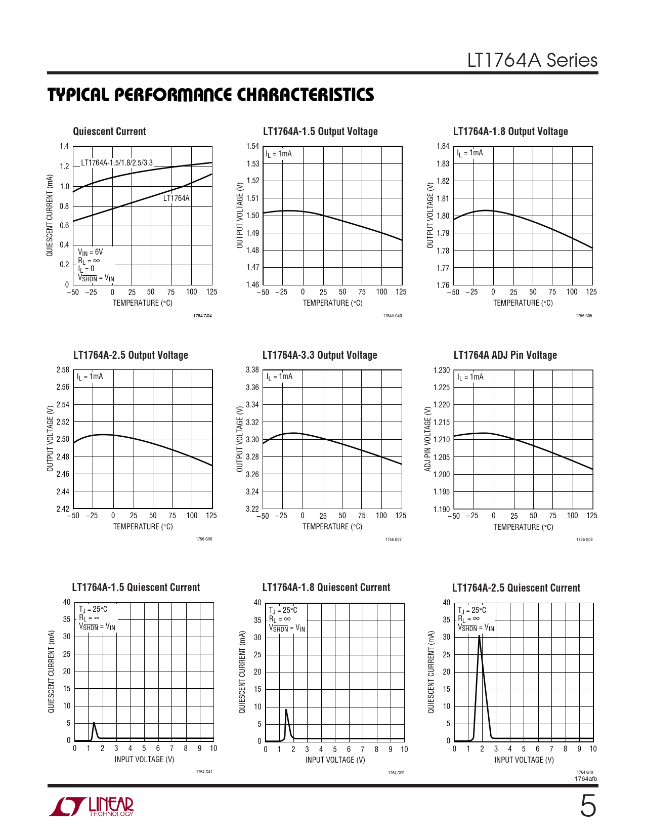 TYPICAL PERFOR A CE CHARACTERISTICS. Quiescent Current. LT1764A-1.5 Output Voltage. LT1764A-1.8 Output Voltage