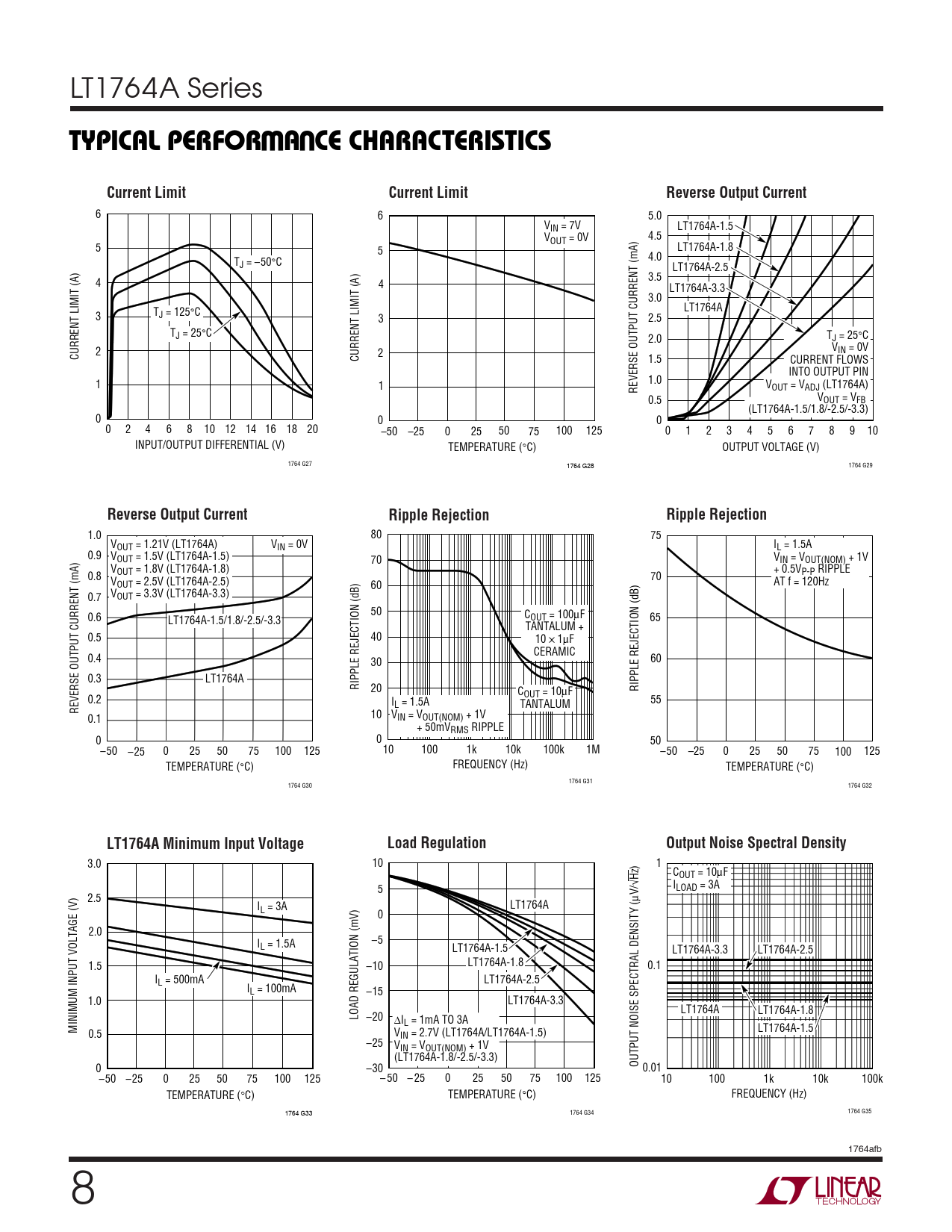 TYPICAL PERFOR A CE CHARACTERISTICS. Current Limit. Reverse Output Current. Ripple Rejection. LT1764A Minimum Input Voltage