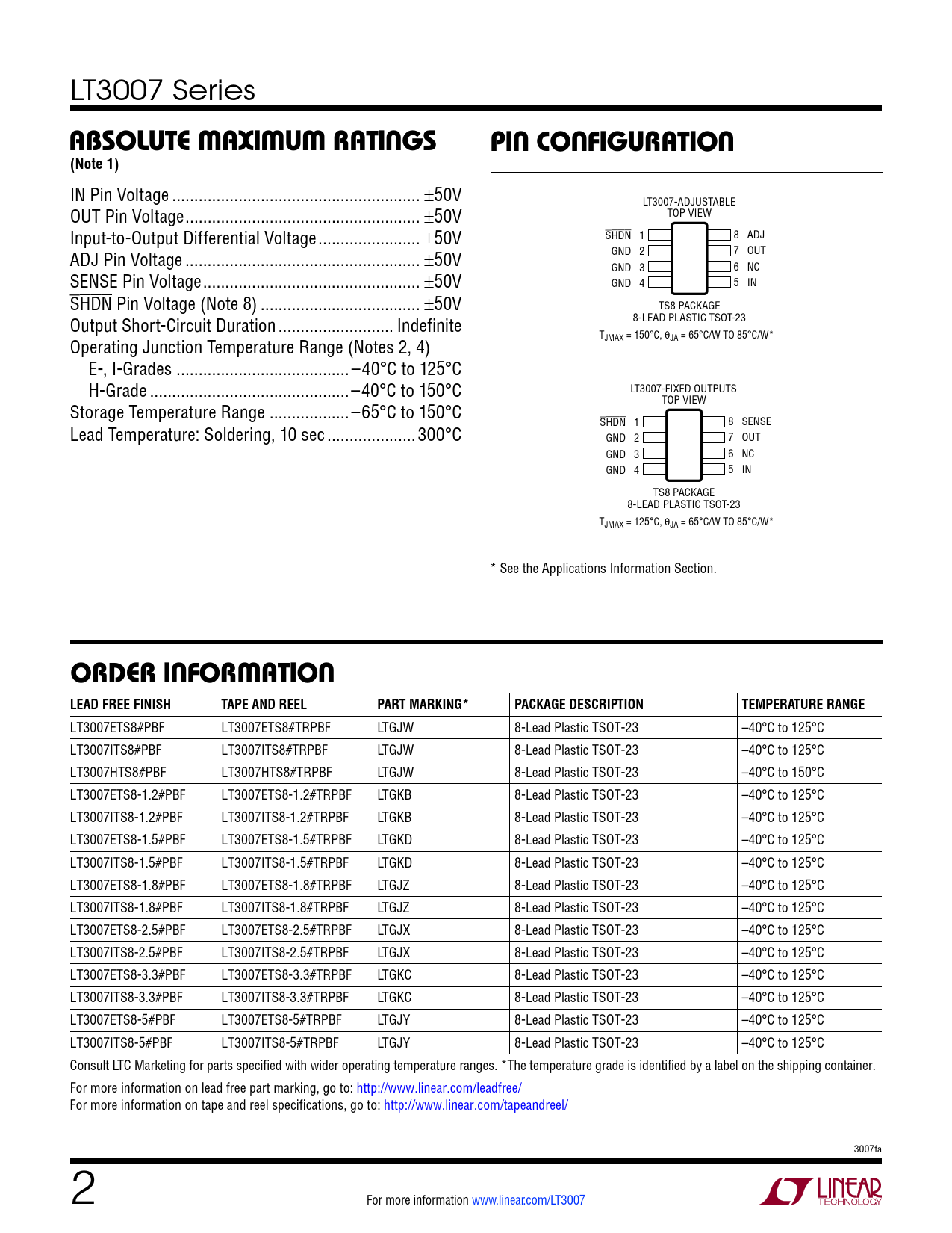 LT3007 Series ABSOLUTE MAXIMUM RATINGSPIN CONFIGURATION(Note 1) IN Pin Voltage .. ±50V LT3007-ADJUSTABLE OUT Pin Voltage ... ±50V TOP VIEW Input-to-Output Differential Voltage ... ±50V SHDN 1 8 ADJ ADJ Pin Voltage ... ±50V GND 2 7 OUT GND 3 6 NC SENSE Pin Voltage ... ±50V GND 4 5 IN SHDN Pin Voltage (Note 8) .. ±50V TS8 PACKAGE Output Short-Circuit Duration .. Indefinite 8-LEAD PLASTIC TSOT-23 T Operating Junction Temperature Range (Notes 2, 4) JMAX = 150°C, θJA = 65°C/W TO 85°C/W* E-, I-Grades ... –40°C to 125°C H-Grade ...–40°C to 150°C LT3007-FIXED OUTPUTS TOP VIEW Storage Temperature Range ..–65°C to 150°C SHDN 1 8 SENSE Lead Temperature: Soldering, 10 sec ..300°C GND 2 7 OUT GND 3 6 NC GND 4 5 IN TS8 PACKAGE 8-LEAD PLASTIC TSOT-23 TJMAX = 125°C, θJA = 65°C/W TO 85°C/W* * See the Applications Information Section. ORDER INFORMATION LEAD FREE FINISHTAPE AND REELPART MARKING*PACKAGE DESCRIPTIONTEMPERATURE RANGE LT3007ETS8#PBF LT3007ETS8#TRPBF LTGJW 8-Lead Plastic TSOT-23 –40°C to 125°C LT3007ITS8#PBF LT3007ITS8#TRPBF LTGJW 8-Lead Plastic TSOT-23 –40°C to 125°C LT3007HTS8#PBF LT3007HTS8#TRPBF LTGJW 8-Lead Plastic TSOT-23 –40°C to 150°C LT3007ETS8-1.2#PBF LT3007ETS8-1.2#TRPBF LTGKB 8-Lead Plastic TSOT-23 –40°C to 125°C LT3007ITS8-1.2#PBF LT3007ITS8-1.2#TRPBF LTGKB 8-Lead Plastic TSOT-23 –40°C to 125°C LT3007ETS8-1.5#PBF LT3007ETS8-1.5#TRPBF LTGKD 8-Lead Plastic TSOT-23 –40°C to 125°C LT3007ITS8-1.5#PBF LT3007ITS8-1.5#TRPBF LTGKD 8-Lead Plastic TSOT-23 –40°C to 125°C LT3007ETS8-1.8#PBF LT3007ETS8-1.8#TRPBF LTGJZ 8-Lead Plastic TSOT-23 –40°C to 125°C LT3007ITS8-1.8#PBF LT3007ITS8-1.8#TRPBF LTGJZ 8-Lead Plastic TSOT-23 –40°C to 125°C LT3007ETS8-2.5#PBF LT3007ETS8-2.5#TRPBF LTGJX 8-Lead Plastic TSOT-23 –40°C to 125°C LT3007ITS8-2.5#PBF LT3007ITS8-2.5#TRPBF LTGJX 8-Lead Plastic TSOT-23 –40°C to 125°C LT3007ETS8-3.3#PBF LT3007ETS8-3.3#TRPBF LTGKC 8-Lead Plastic TSOT-23 –40°C to 125°C LT3007ITS8-3.3#PBF LT3007ITS8-3.3#TRPBF LTGKC 8-Lead Plastic TSOT-23 –40°C to 125°C LT3007ETS8-5#PBF LT3007ETS8-5#TRPBF LTGJY 8-Lead Plastic TSOT-23 –40°C to 125°C LT3007ITS8-5#PBF LT3007ITS8-5#TRPBF LTGJY 8-Lead Plastic TSOT-23 –40°C to 125°C Consult LTC Marketing for parts specified with wider operating temperature ranges. *The temperature grade is identified by a label on the shipping container. For more information on lead free part marking, go to: http://www.linear.com/leadfree/ For more information on tape and reel specifications, go to: http://www.linear.com/tapeandreel/ 3007fa 2 For more information www.linear.com/LT3007