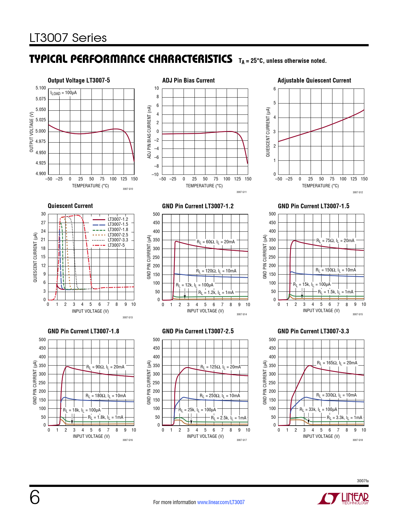 5.100 10 6 ILOAD = 100µA 5.075 8 6 5 5.050 4 5.025 4 2 5.000 0 3 4.975 –2 2 OUTPUT VOLTAGE (V) –4 4.950 ADJ PIN BIAS CURRENT (nA) –6 QUIESCENT CURRENT (µA) 4.925 1 –8 4.900 –10 0 –50 –25 0 25 50 75 100 125 150 –50 –25 0 25 50 75 100 125 150 –50 –25 0 25 50 75 100 125 150 TEMPERATURE (°C) TEMPERATURE (°C) TEMPERATURE (°C) 3007 G10 3007 G11 3007 G12