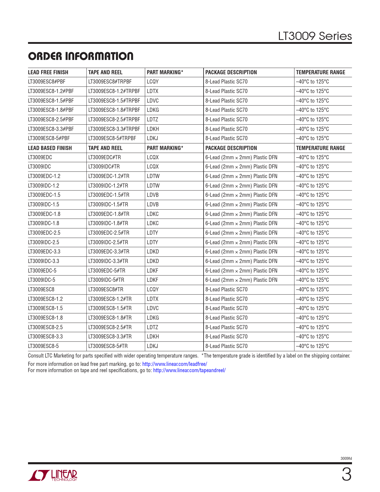 LT3009EDC LT3009EDC#TR LCQX 6-Lead (2mm × 2mm) Plastic DFN –40°C to 125°C LT3009IDC LT3009IDC#TR LCQX 6-Lead (2mm × 2mm) Plastic DFN –40°C to 125°C LT3009EDC-1.2 LT3009EDC-1.2#TR LDTW 6-Lead (2mm × 2mm) Plastic DFN –40°C to 125°C LT3009IDC-1.2 LT3009IDC-1.2#TR LDTW 6-Lead (2mm × 2mm) Plastic DFN –40°C to 125°C LT3009EDC-1.5 LT3009EDC-1.5#TR LDVB 6-Lead (2mm × 2mm) Plastic DFN –40°C to 125°C LT3009IDC-1.5 LT3009IDC-1.5#TR LDVB 6-Lead (2mm × 2mm) Plastic DFN –40°C to 125°C LT3009EDC-1.8 LT3009EDC-1.8#TR LDKC 6-Lead (2mm × 2mm) Plastic DFN –40°C to 125°C LT3009IDC-1.8 LT3009IDC-1.8#TR LDKC 6-Lead (2mm × 2mm) Plastic DFN –40°C to 125°C LT3009EDC-2.5 LT3009EDC-2.5#TR LDTY 6-Lead (2mm × 2mm) Plastic DFN –40°C to 125°C LT3009IDC-2.5 LT3009IDC-2.5#TR LDTY 6-Lead (2mm × 2mm) Plastic DFN –40°C to 125°C LT3009EDC-3.3 LT3009EDC-3.3#TR LDKD 6-Lead (2mm × 2mm) Plastic DFN –40°C to 125°C LT3009IDC-3.3 LT3009IDC-3.3#TR LDKD 6-Lead (2mm × 2mm) Plastic DFN –40°C to 125°C LT3009EDC-5 LT3009EDC-5#TR LDKF 6-Lead (2mm × 2mm) Plastic DFN –40°C to 125°C LT3009IDC-5 LT3009IDC-5#TR LDKF 6-Lead (2mm × 2mm) Plastic DFN –40°C to 125°C LT3009ESC8 LT3009ESC8#TR LCQY 8-Lead Plastic SC70 –40°C to 125°C LT3009ESC8-1.2 LT3009ESC8-1.2#TR LDTX 8-Lead Plastic SC70 –40°C to 125°C LT3009ESC8-1.5 LT3009ESC8-1.5#TR LDVC 8-Lead Plastic SC70 –40°C to 125°C LT3009ESC8-1.8 LT3009ESC8-1.8#TR LDKG 8-Lead Plastic SC70 –40°C to 125°C LT3009ESC8-2.5 LT3009ESC8-2.5#TR LDTZ 8-Lead Plastic SC70 –40°C to 125°C LT3009ESC8-3.3 LT3009ESC8-3.3#TR LDKH 8-Lead Plastic SC70 –40°C to 125°C LT3009ESC8-5 LT3009ESC8-5#TR LDKJ 8-Lead Plastic SC70 –40°C to 125°C Consult LTC Marketing for parts specifi ed with wider operating temperature ranges. *The temperature grade is identifi ed by a label on the shipping container. For more information on lead free part marking, go to: http://www.linear.com/leadfree/ For more information on tape and reel specifi cations, go to: http://www.linear.com/tapeandreel/ 3009fd 3