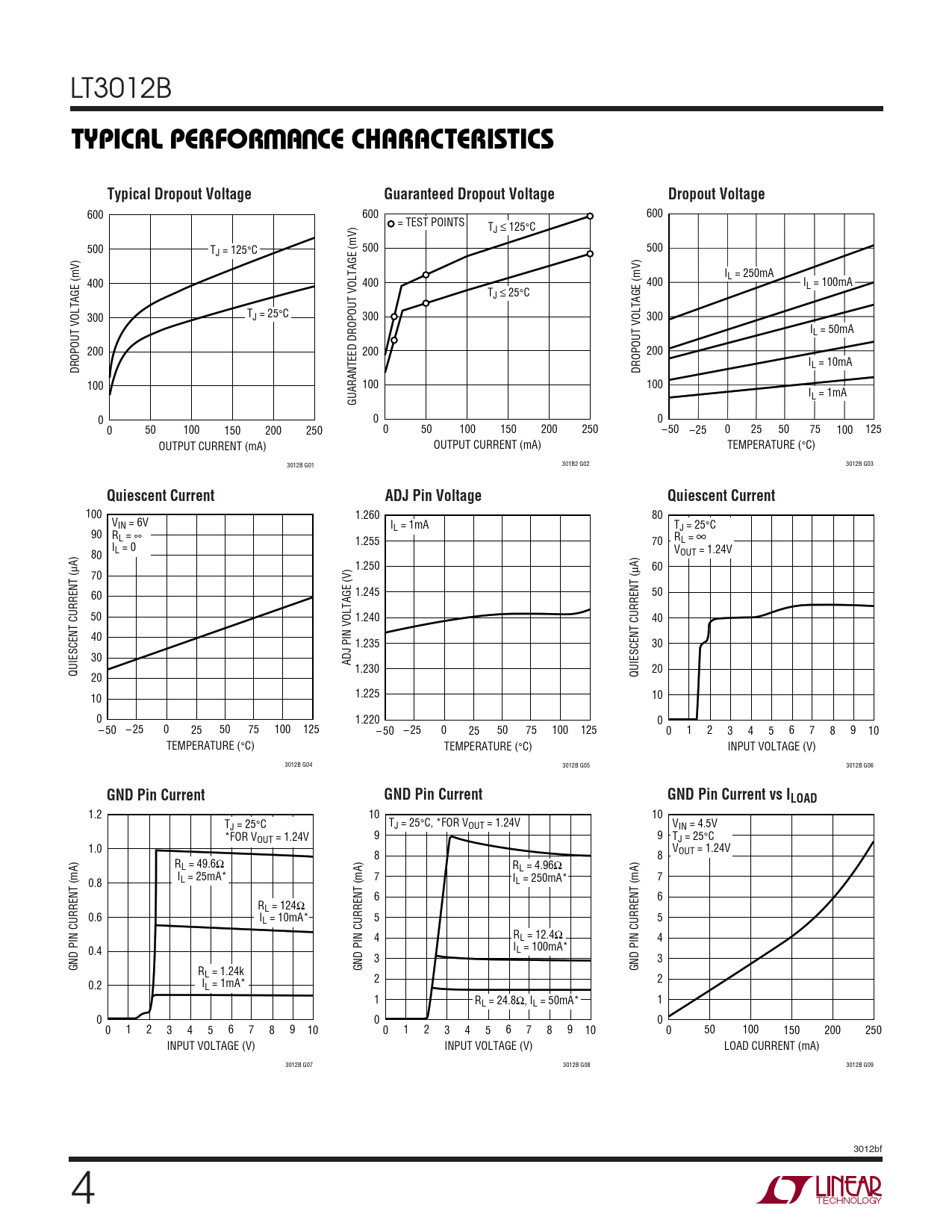 1.2 10 10 T T J = 25°C J = 25°C, *FOR VOUT = 1.24V VIN = 4.5V *FOR VOUT = 1.24V 9 9 TJ = 25°C 1.0 V 8 8 OUT = 1.24V RL = 49.6Ω RL = 4.96Ω I 7 I 7 0.8 L = 25mA* L = 250mA* 6 6 RL = 124Ω 0.6 IL = 10mA* 5 5 4 RL = 12.4Ω 4 0.4 IL = 100mA* 3 3 GND PIN CURRENT (mA) R GND PIN CURRENT (mA) GND PIN CURRENT (mA) L = 1.24k 2 2 0.2 IL = 1mA* 1 R 1 L = 24.8Ω, IL = 50mA* 0 0 0 0 1 2 3 4 5 6 7 8 9 10 0 1 2 3 4 5 6 7 8 9 10 0 50 100 150 200 250 INPUT VOLTAGE (V) INPUT VOLTAGE (V) LOAD CURRENT (mA) 3012B G07 3012B G08 3012B G09 3012bf 4