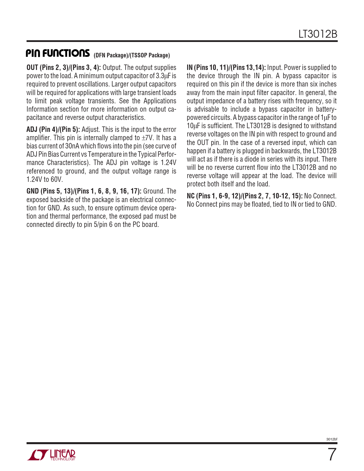 LT3012B UUUPI FU CTIO S (DFN Package)/(TSSOP Package)OUT (Pins 2, 3)/(Pins 3, 4): Output. The output supplies IN (Pins 10, 11)/(Pins 13,14): Input. Power is supplied to power to the load. A minimum output capacitor of 3.3µF is the device through the IN pin. A bypass capacitor is required to prevent oscillations. Larger output capacitors required on this pin if the device is more than six inches will be required for applications with large transient loads away from the main input filter capacitor. In general, the to limit peak voltage transients. See the Applications output impedance of a battery rises with frequency, so it Information section for more information on output ca- is advisable to include a bypass capacitor in battery- pacitance and reverse output characteristics. powered circuits. A bypass capacitor in the range of 1µF to 10µF is sufficient. The LT3012B is designed to withstand ADJ (Pin 4)/(Pin 5): Adjust. This is the input to the error reverse voltages on the IN pin with respect to ground and amplifier. This pin is internally clamped to ±7V. It has a the OUT pin. In the case of a reversed input, which can bias current of 30nA which flows into the pin (see curve of happen if a battery is plugged in backwards, the LT3012B ADJ Pin Bias Current vs Temperature in the Typical Perfor- will act as if there is a diode in series with its input. There mance Characteristics). The ADJ pin voltage is 1.24V will be no reverse current flow into the LT3012B and no referenced to ground, and the output voltage range is reverse voltage will appear at the load. The device will 1.24V to 60V. protect both itself and the load. GND (Pins 5, 13)/(Pins 1, 6, 8, 9, 16, 17): Ground. The NC (Pins 1, 6-9, 12)/(Pins 2, 7, 10-12, 15): No Connect. exposed backside of the package is an electrical connec- No Connect pins may be floated, tied to IN or tied to GND. tion for GND. As such, to ensure optimum device opera- tion and thermal performance, the exposed pad must be connected directly to pin 5/pin 6 on the PC board. 3012bf 7