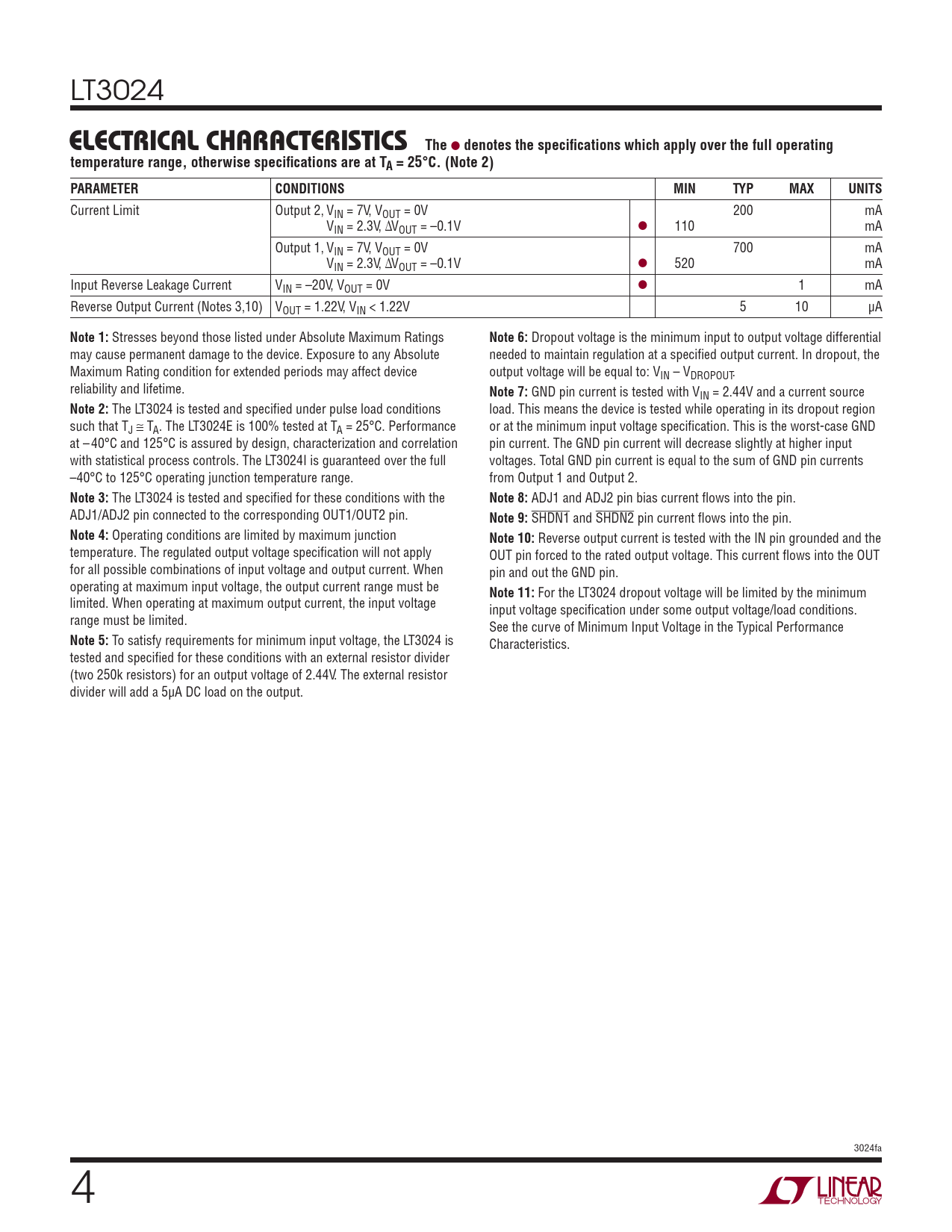 To satisfy requirements for minimum input voltage, the LT3024 is Characteristics. tested and specifi ed for these conditions with an external resistor divider (two 250k resistors) for an output voltage of 2.44V. The external resistor divider will add a 5μA DC load on the output. 3024fa 4