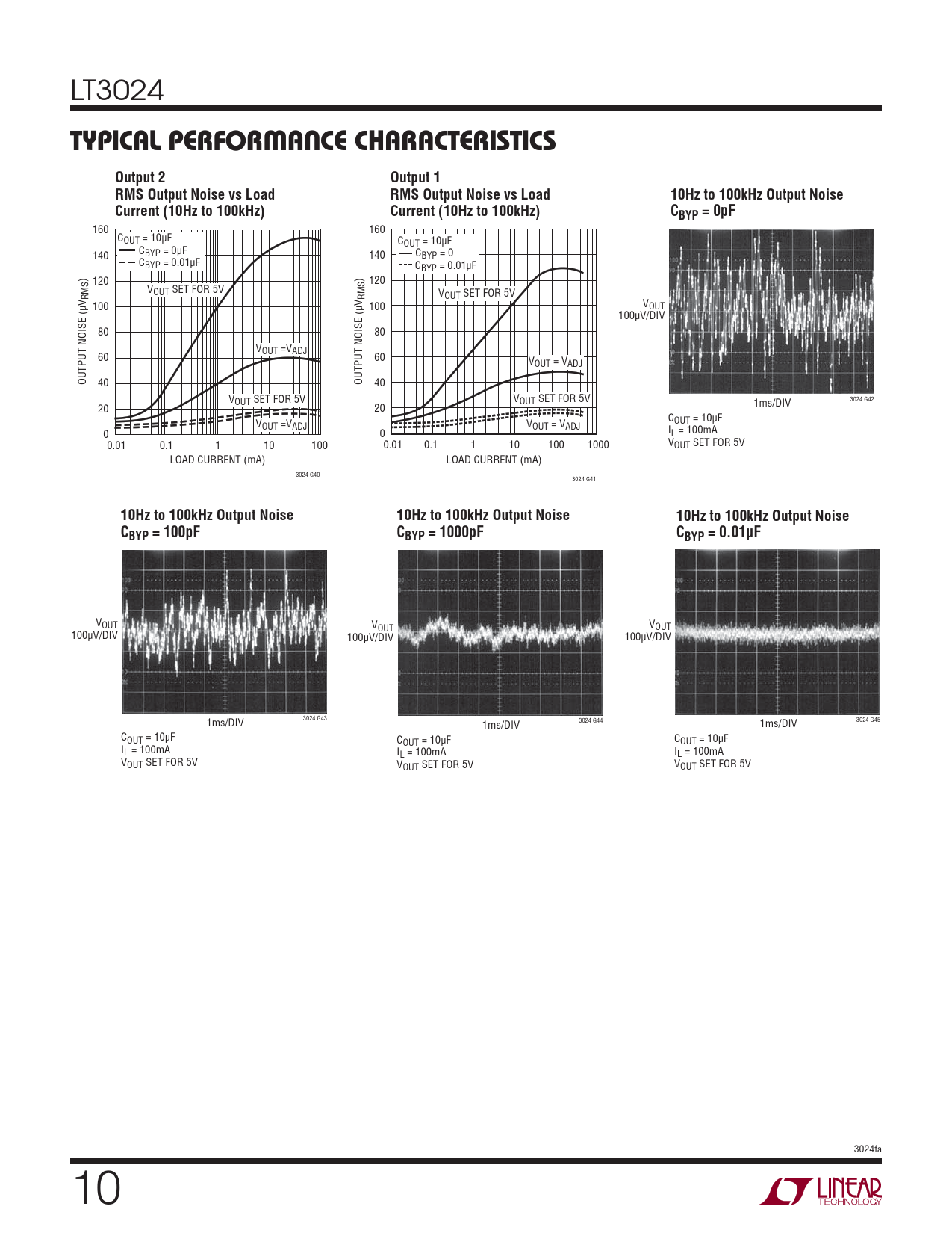 LT3024 TYPICAL PERFORMANCE CHARACTERISTICSOutput 2Output 1RMS Output Noise vs LoadRMS Output Noise vs Load10Hz to 100kHz Output NoiseCurrent (10Hz to 100kHz)Current (10Hz to 100kHz)CBYP = 0pF 160 160 COUT = 10μF COUT = 10μF 140 CBYP = 0μF 140 CBYP = 0 CBYP = 0.01μF CBYP = 0.01μF ) 120 ) 120 VOUT SET FOR 5V RMS RMS VOUT SET FOR 5V V V V 100 100 OUT 100μV/DIV 80 80 VOUT =VADJ 60 60 VOUT = VADJ OUTPUT NOISE (μ 40 OUTPUT NOISE (μ 40 VOUT SET FOR 5V VOUT SET FOR 5V 1ms/DIV 3024 G42 20 20 COUT = 10μF VOUT =VADJ VOUT = VADJ I 0 0 L = 100mA V 0.01 0.1 1 10 100 0.01 0.1 1 10 100 1000 OUT SET FOR 5V LOAD CURRENT (mA) LOAD CURRENT (mA) 3024 G40 3024 G41 10Hz to 100kHz Output Noise10Hz to 100kHz Output Noise10Hz to 100kHz Output NoiseCCBYP = 100pFBYP = 1000pFCBYP = 0.01µF VOUT V V OUT OUT 100μV/DIV 100μV/DIV 100μV/DIV 1ms/DIV 3024 G43 1ms/DIV 3024 G44 1ms/DIV 3024 G45 COUT = 10μF C C OUT = 10μF OUT = 10μF IL = 100mA I I L = 100mA L = 100mA VOUT SET FOR 5V V V OUT SET FOR 5V OUT SET FOR 5V 3024fa 10