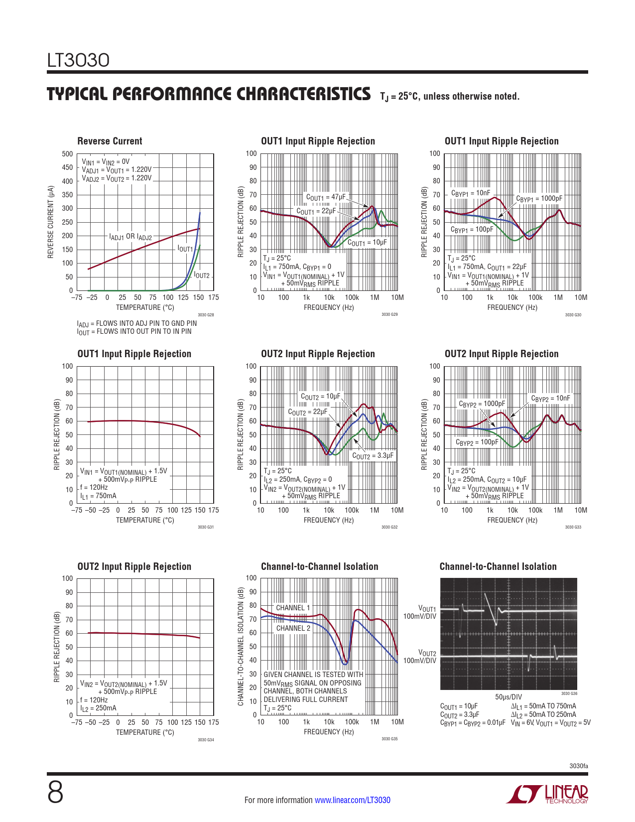 500 100 100 V 450 IN1 = VIN2 = 0V V 90 90 ADJ1 = VOUT1 = 1.220V 400 VADJ2 = VOUT2 = 1.220V 80 80 350 70 C 70 CBYP1 = 10nF OUT1 = 47µF CBYP1 = 1000pF 300 60 C 60 OUT1 = 22µF 250 50 50 CBYP1 = 100pF 200 IADJ1 OR IADJ2 40 40 COUT1 = 10µF 150 IOUT1 30 30 REVERSE CURRENT (µA) RIPPLE REJECTION (dB) T RIPPLE REJECTION (dB) T 100 20 J = 25°C J = 25°C I 20 L1 = 750mA, CBYP1 = 0 IL1 = 750mA, COUT1 = 22µF 50 IOUT2 10 VIN1 = VOUT1(NOMINAL) + 1V 10 VIN1 = VOUT1(NOMINAL) + 1V + 50mVRMS RIPPLE + 50mVRMS RIPPLE 0 0 0 –75 –25 0 25 50 75 100 125 150 175 10 100 1k 10k 100k 1M 10M 10 100 1k 10k 100k 1M 10M TEMPERATURE (°C) FREQUENCY (Hz) FREQUENCY (Hz) 3030 G28 3030 G29 3030 G30 IADJ = FLOWS INTO ADJ PIN TO GND PIN IOUT = FLOWS INTO OUT PIN TO IN PIN