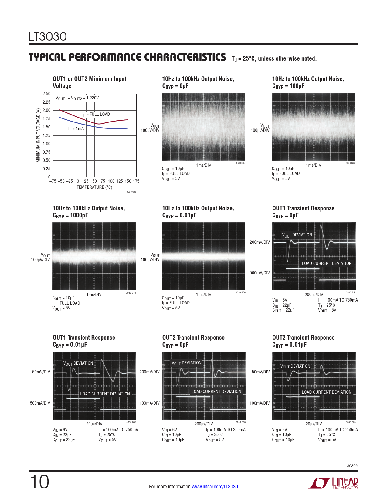 VOUT DEVIATION VOUT DEVIATION VOUT DEVIATION 50mV/DIV 200mV/DIV 50mV/DIV LOAD CURRENT DEVIATION LOAD CURRENT DEVIATION LOAD CURRENT DEVIATION 500mA/DIV 100mA/DIV 100mA/DIV 20µs/DIV 3030 G52 200µs/DIV 3030 G53 20µs/DIV 3030 G54 VIN = 6V IL = 100mA TO 750mA VIN = 6V IL = 100mA TO 250mA VIN = 6V IL = 100mA TO 250mA CIN = 22µF TJ = 25°C CIN = 10µF TJ = 25°C CIN = 10µF TJ = 25°C COUT = 22µF VOUT = 5V COUT = 10µF VOUT = 5V COUT = 10µF VOUT = 5V 3030fa 10 For more information www.linear.com/LT3030 Document Outline Features Description Applications Typical Application Absolute Maximum Ratings Pin Configuration Order Information Electrical Characteristics Typical Performance Characteristics Pin Functions Applications Information Typical Applications Package Description Revision History Typical Application Related Parts